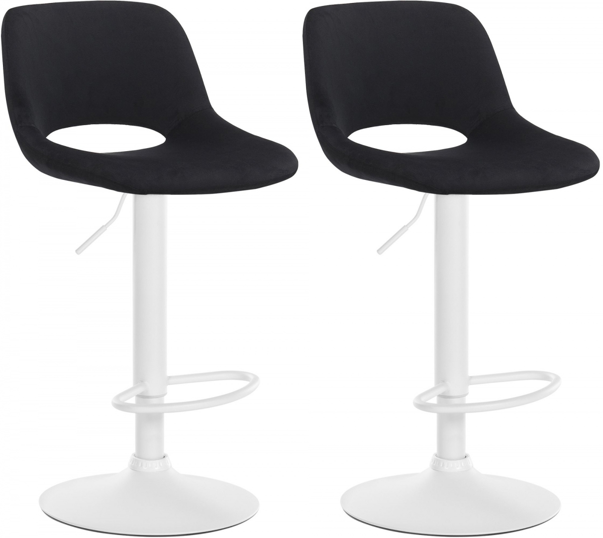 Sada 2 moderních barových židlí Camden s potahem z umělého sametu. Pohodlné polstrování, výškově nastavitelné, otočné o 360°, s opěrkami nohou a chrániči podlahy. Ideální do domácího baru nebo kuchyně.