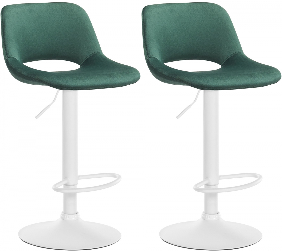 Sada 2 moderních barových židlí Camden s potahem z umělého sametu. Pohodlné polstrování, výškově nastavitelné, otočné o 360°, s opěrkami nohou a chrániči podlahy. Ideální do domácího baru nebo kuchyně.