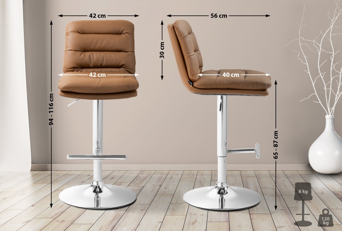 Rám taburetu a módní potah dodávají taburetce elegantní vzhled. Sedák je potažen umělou kůží, která se snadno udržuje. Kovový rám je výškově nastavitelný a funkce otáčení o 360 stupňů zajišťuje dostatek volnosti pohybu.