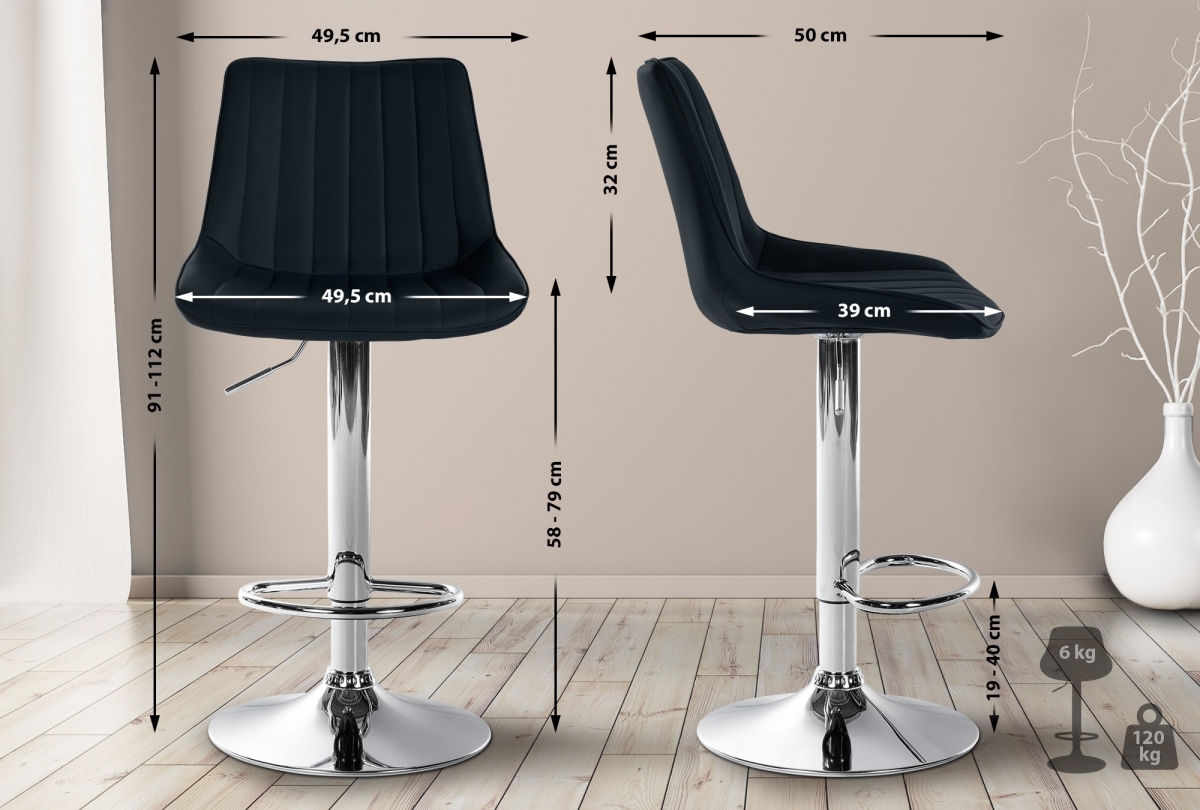 Sada 2 moderních barových židlí Toni s nastavitelnou výškou a otočným sedátkem. Pohodlné polstrování, stabilní kovová konstrukce a snadná údržba pro maximální komfort a dlouhou životnost. Ideální pro domácí bar nebo kuchyňský pult.