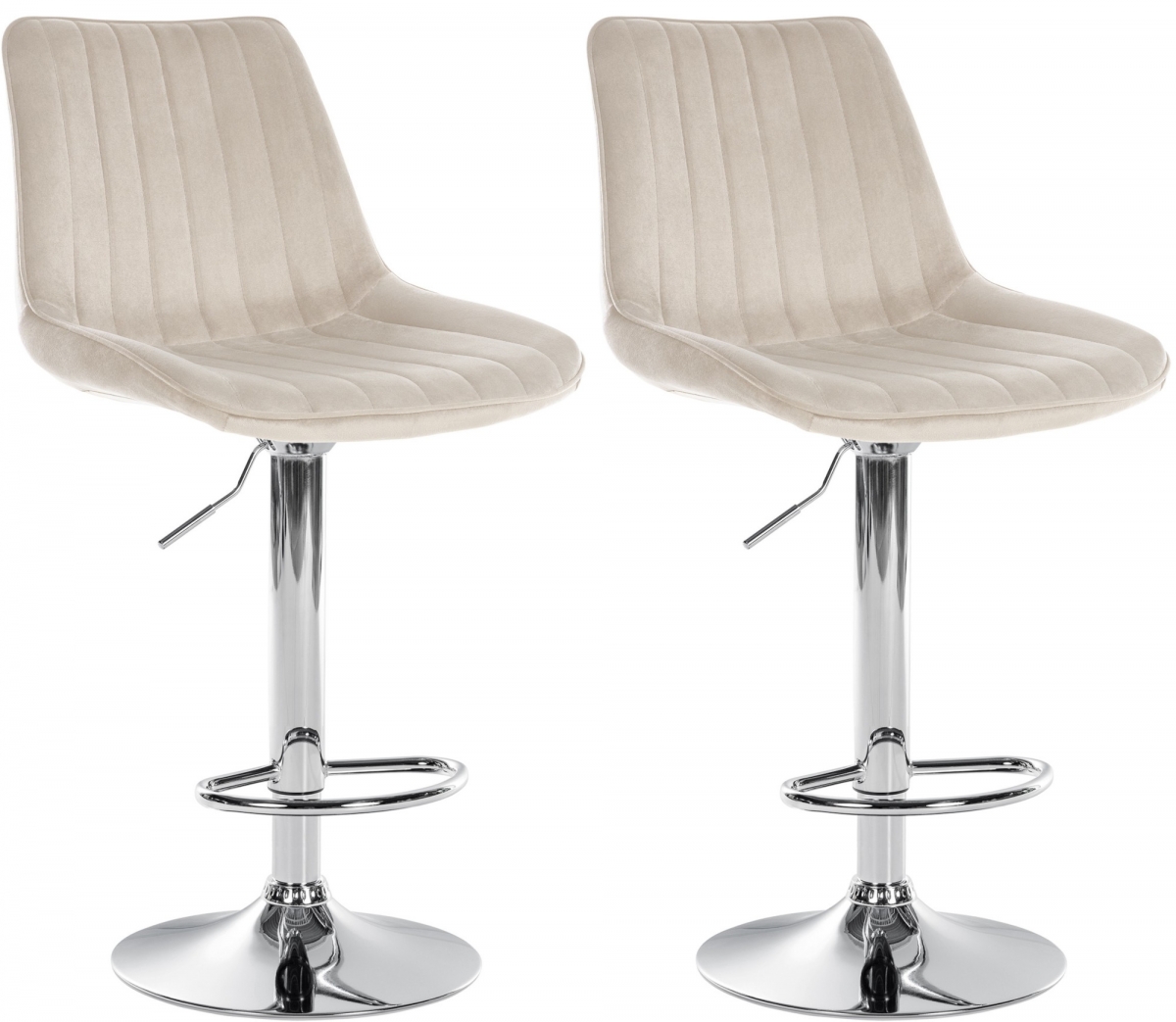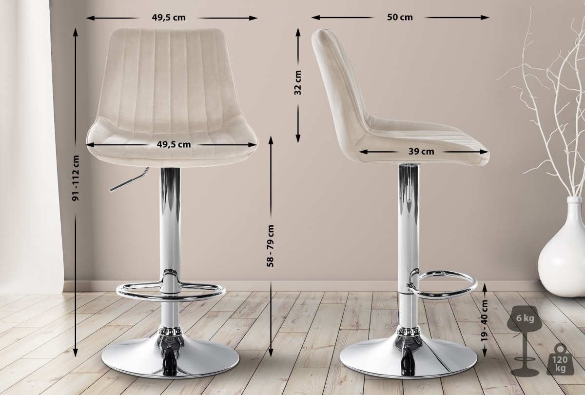Sada 2 moderních barových židlí Toni s nastavitelnou výškou a otočným sedátkem. Pohodlné polstrování, stabilní kovová konstrukce a snadná údržba pro maximální komfort a dlouhou životnost. Ideální pro domácí bar nebo kuchyňský pult.