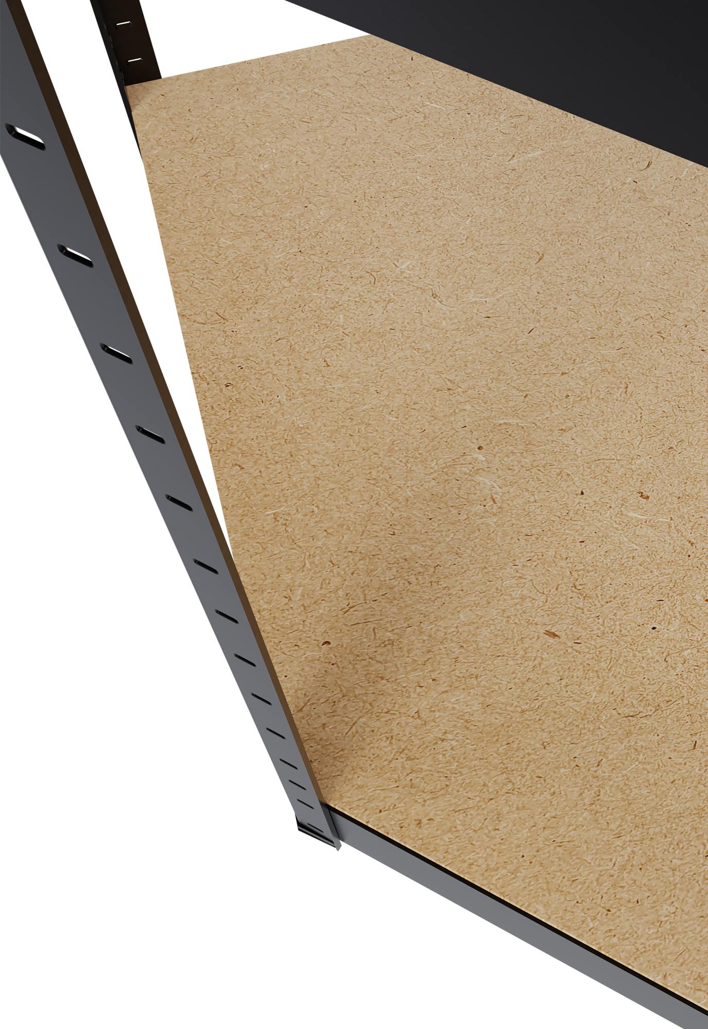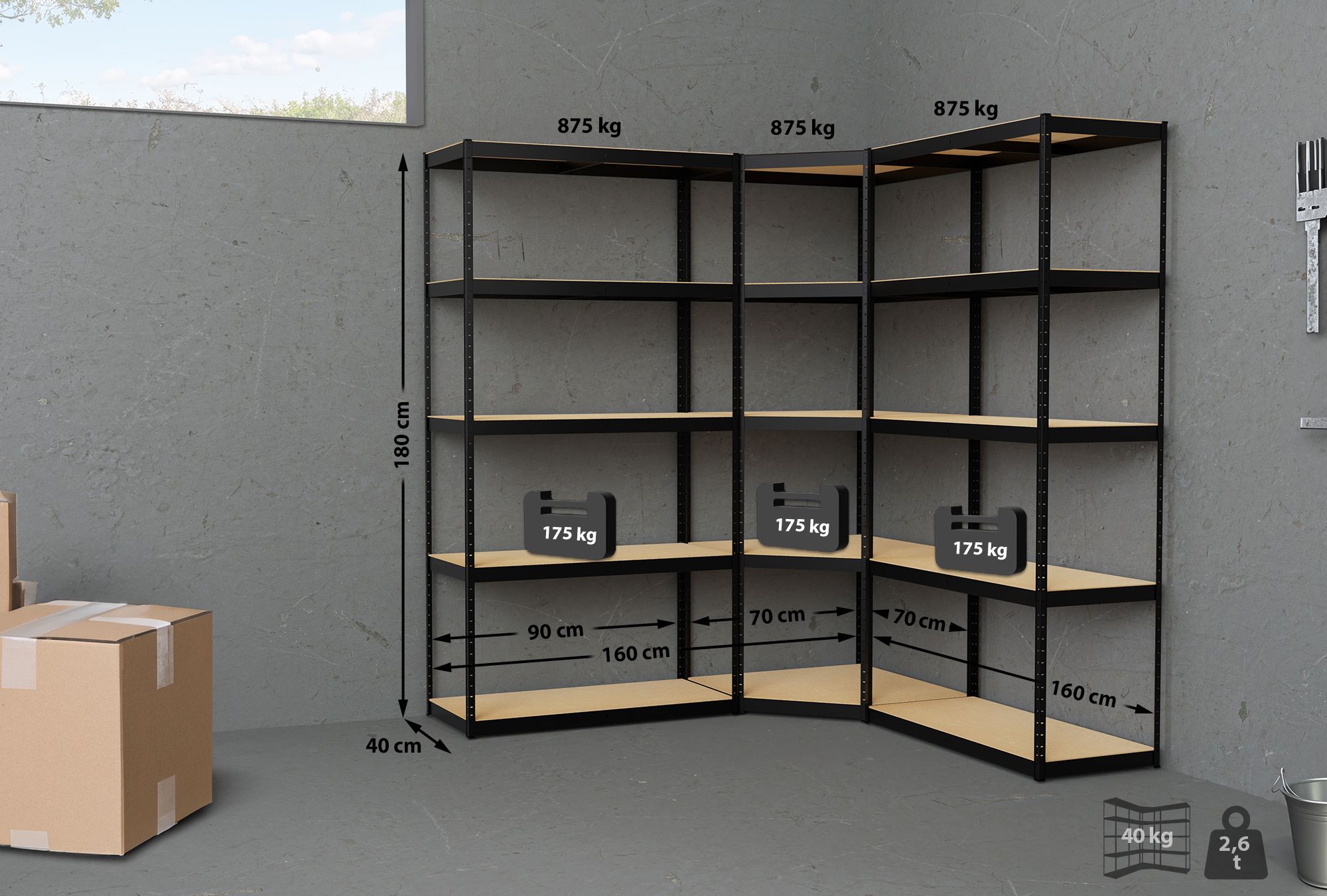 Tento třídílný policový systém je ideální pro skladování těžkých předmětů. Tento policový systém se skládá ze dvou identických polic a jedné rohové police a je vhodný zejména do obdélníkových skladovacích prostor. Tato sada polic je ideální do sklepů, dílen, skladů a garáží.