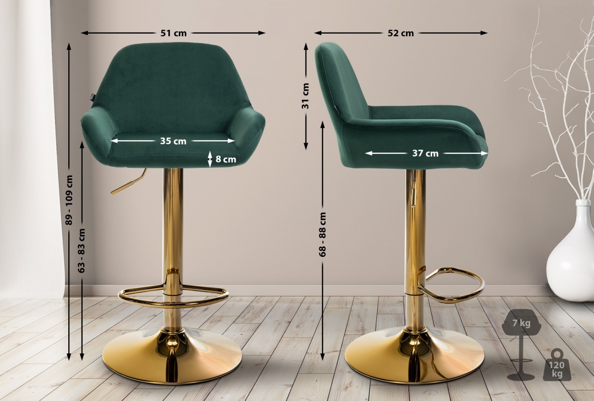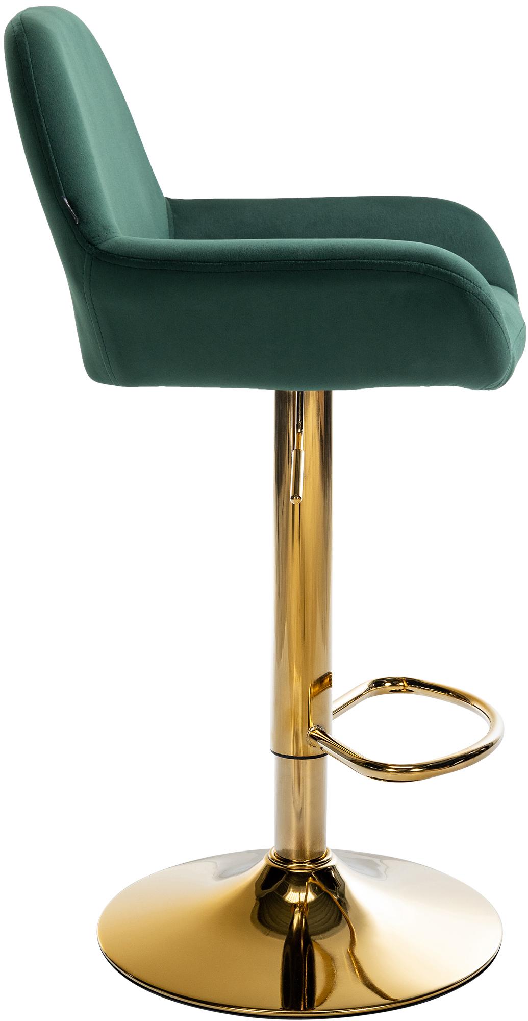 Elegantní barová židle s otočným čalouněným sedadlem a nastavitelnou výškou. Kovový rám se zlatým vzhledem a potah z umělého sametu dodávají nadčasový design. Ideální do moderního interiéru nebo domácího baru.