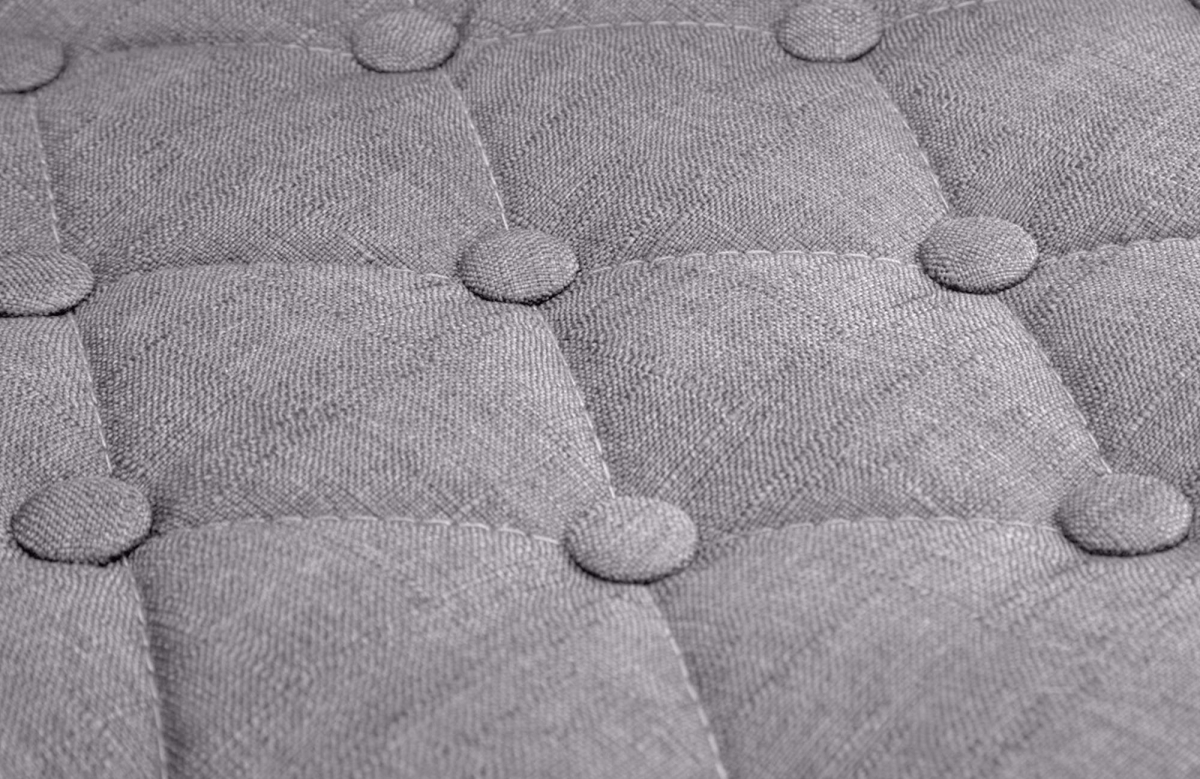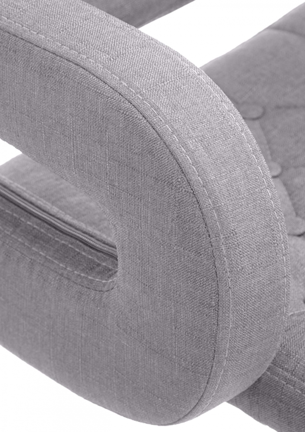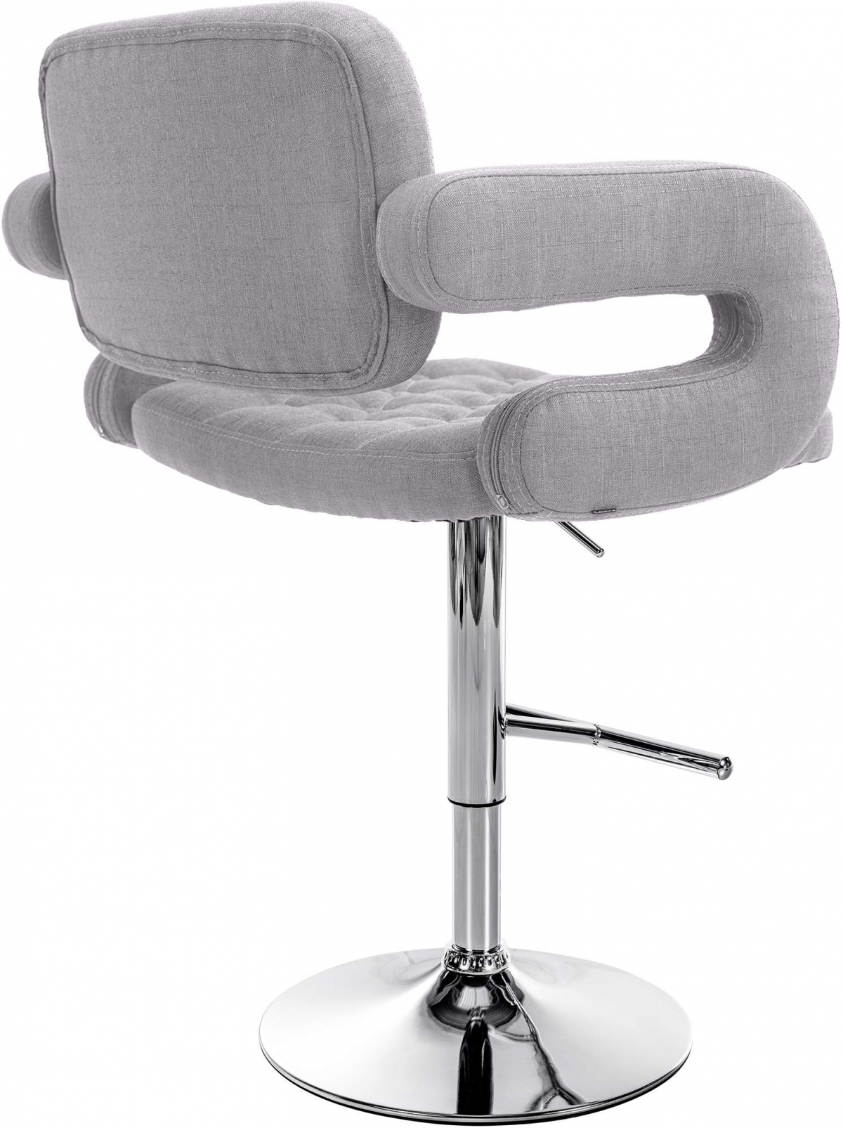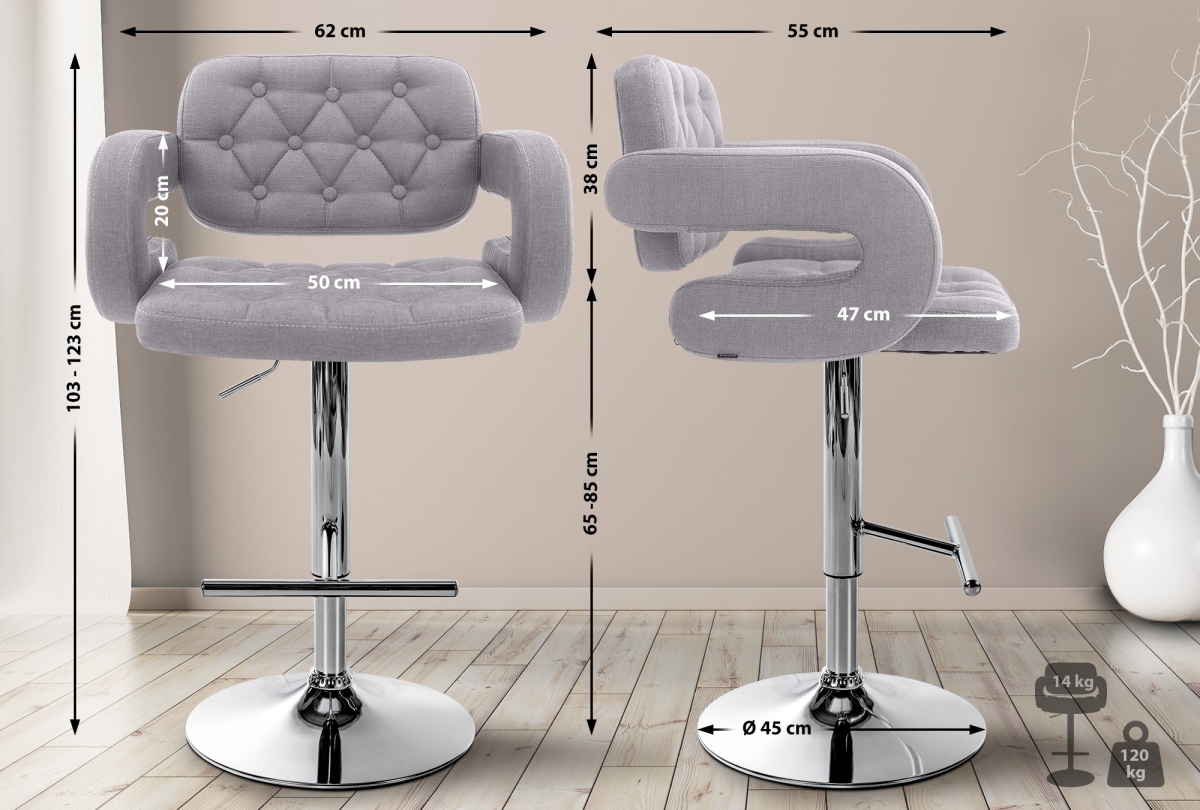 Barová židle má vysoké opěrky na ruce a záda, které poskytují pohodlné posezení. Čalounění je zdobené knoflíky, které podtrhují exkluzivní vzhled této praktické barové židle.