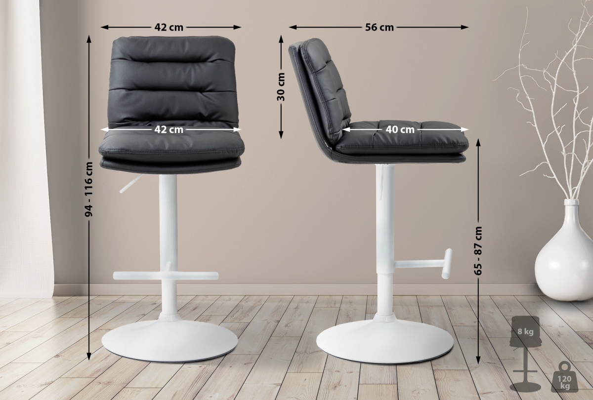 Moderní barová židle Damar s koženkovým potahem nabízí maximální komfort díky polstrovanému sedadlu a opěradlu. Výškově nastavitelná a otočná, s nosností až 120 kg, je ideální do kuchyně nebo baru.