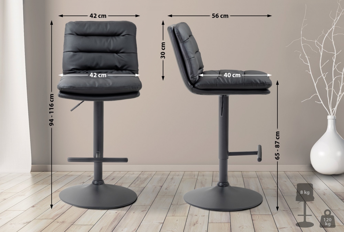 Moderní barová židle Damar s koženkovým potahem nabízí maximální komfort díky polstrovanému sedadlu a opěradlu. Výškově nastavitelná a otočná, s nosností až 120 kg, je ideální do kuchyně nebo baru.