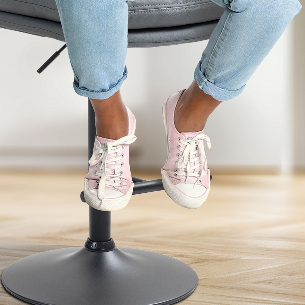 Rám taburetu a módní potah dodávají taburetce elegantní vzhled. Sedák je potažen umělou kůží, která se snadno udržuje. Kovový rám je výškově nastavitelný a funkce otáčení o 360 stupňů zajišťuje dostatek volnosti pohybu.