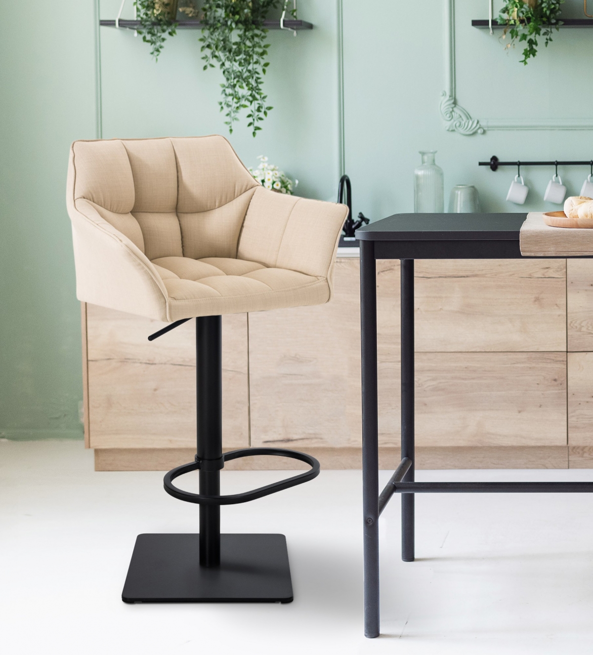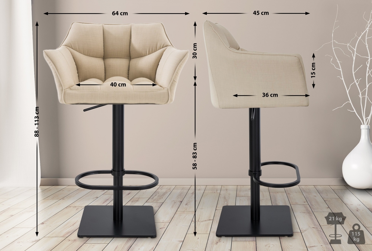 Trendy barová židle s černým rámem a pohodlným čalouněným sedátkem. Moderní design s praktickými područkami, otáčením a nastavitelnou výškou sedáku 58-83 cm pro maximální komfort při posezení.