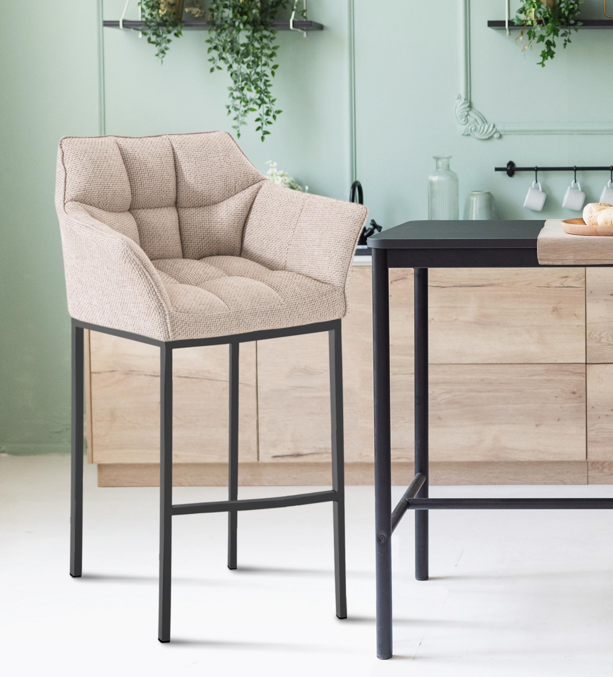 Moderní barová židle s černou 4-nohou základnou nabízí vysoký komfort díky čalouněnému sedáku a opěradlu. Praktické područky a opěrky nohou zajišťují správné držení těla. Stylový design a kvalitní materiály pro váš interiér.