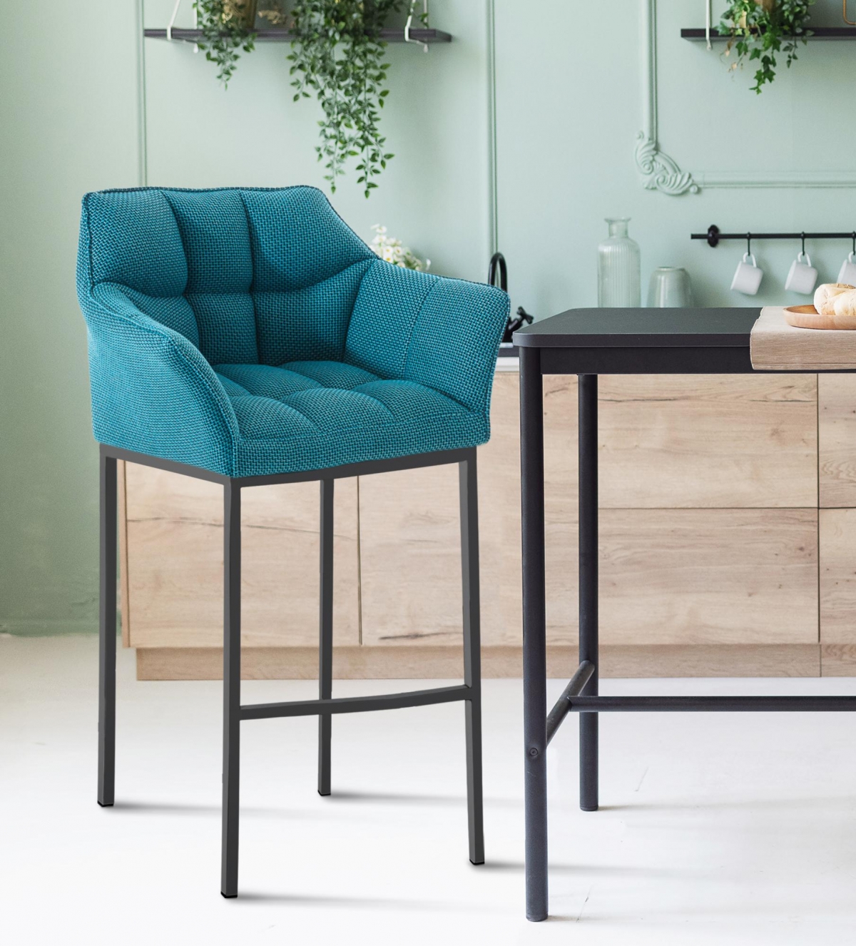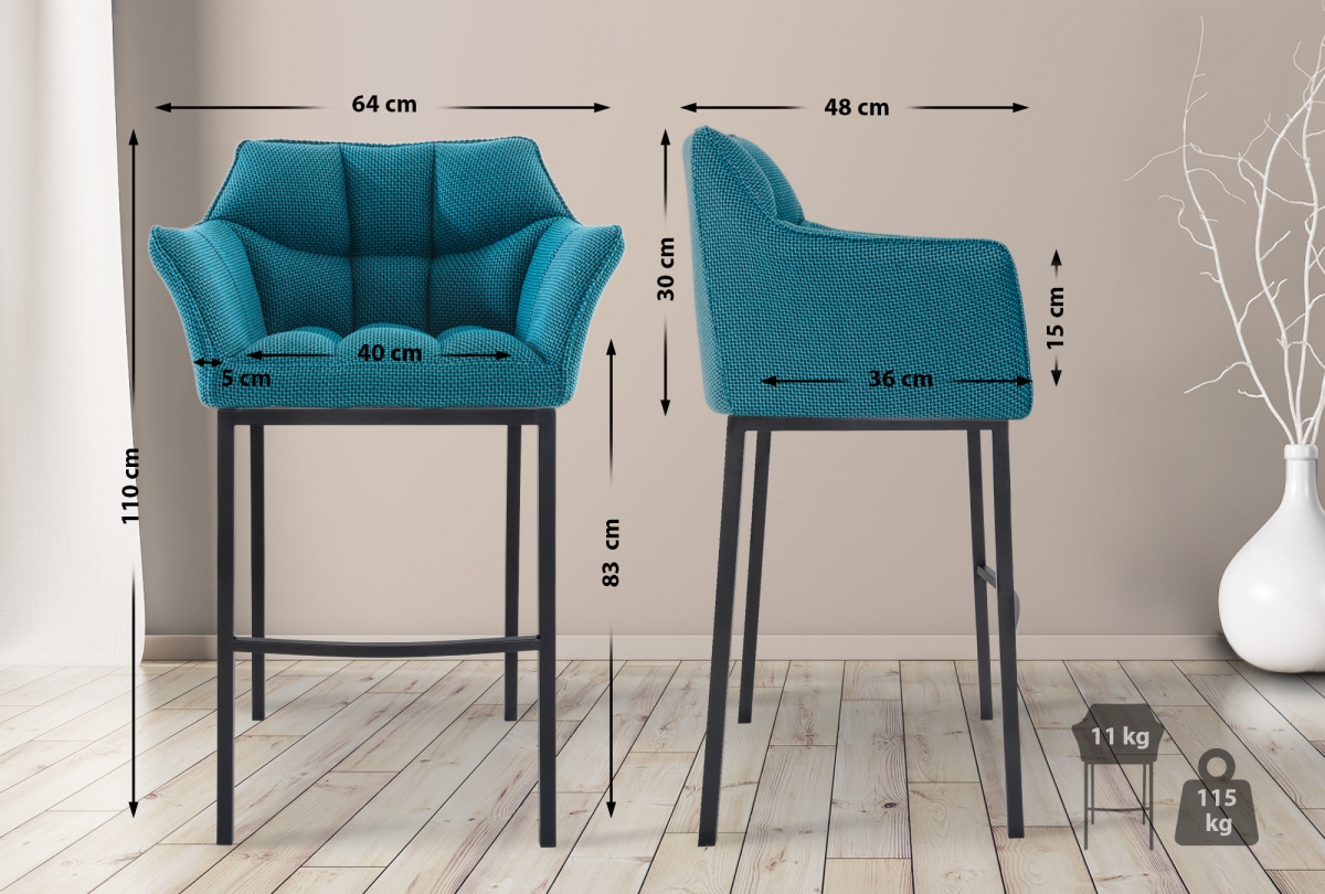Moderní barová židle s černou 4-nohou základnou nabízí vysoký komfort díky čalouněnému sedáku a opěradlu. Praktické područky a opěrky nohou zajišťují správné držení těla. Stylový design a kvalitní materiály pro váš interiér.