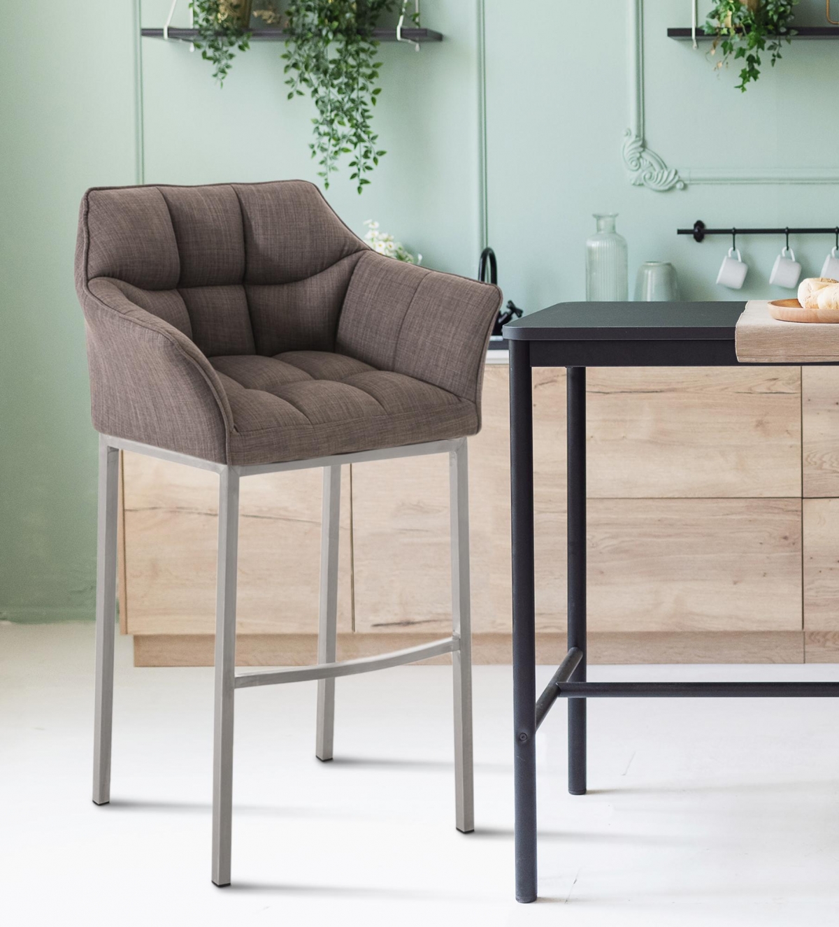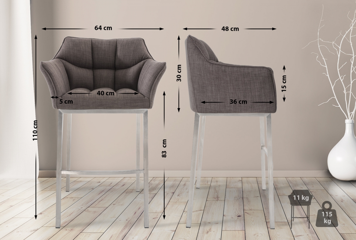 Moderní barová židle s nerezovou 4-nohou základnou nabízí maximální komfort díky čalouněnému sedáku, opěradlu a praktickým područkám. Ergonomický design s opěrkami nohou zajišťuje správné držení těla při sezení ve výšce 83 cm.