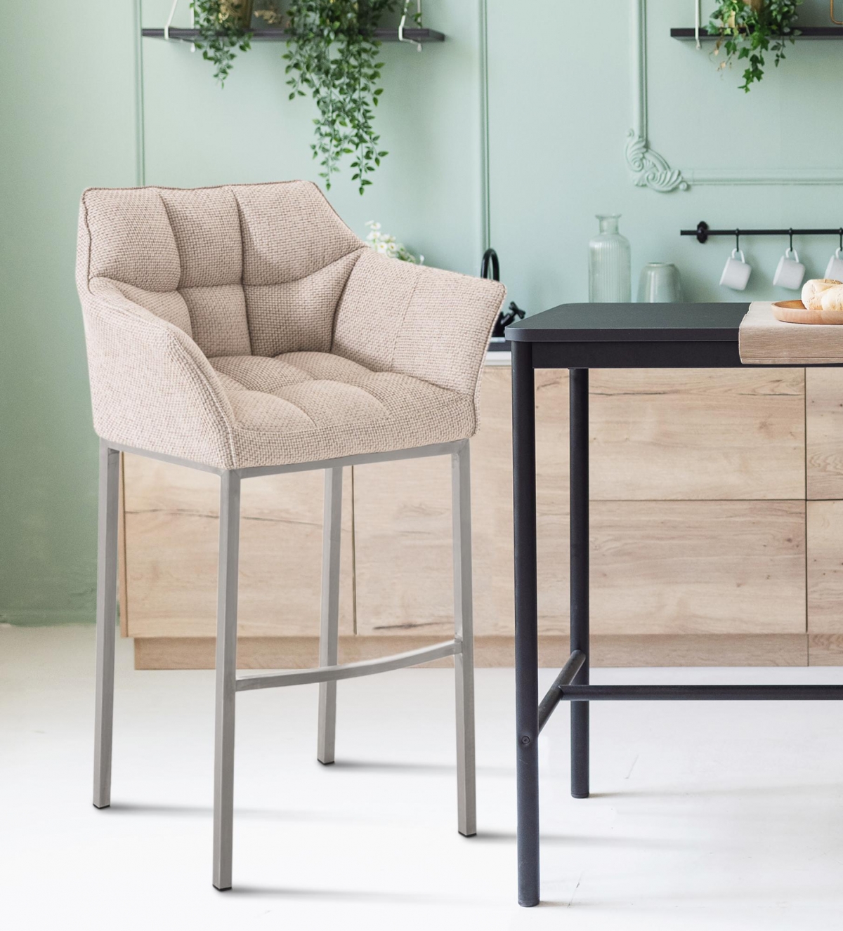 Moderní barová židle s nerezovou 4-nohou základnou nabízí maximální komfort díky čalouněnému sedáku, opěradlu a praktickým područkám. Ergonomický design s opěrkami nohou zajišťuje správné držení těla při sezení ve výšce 83 cm.