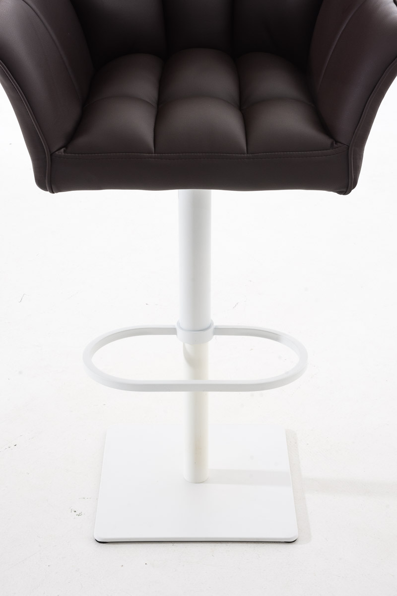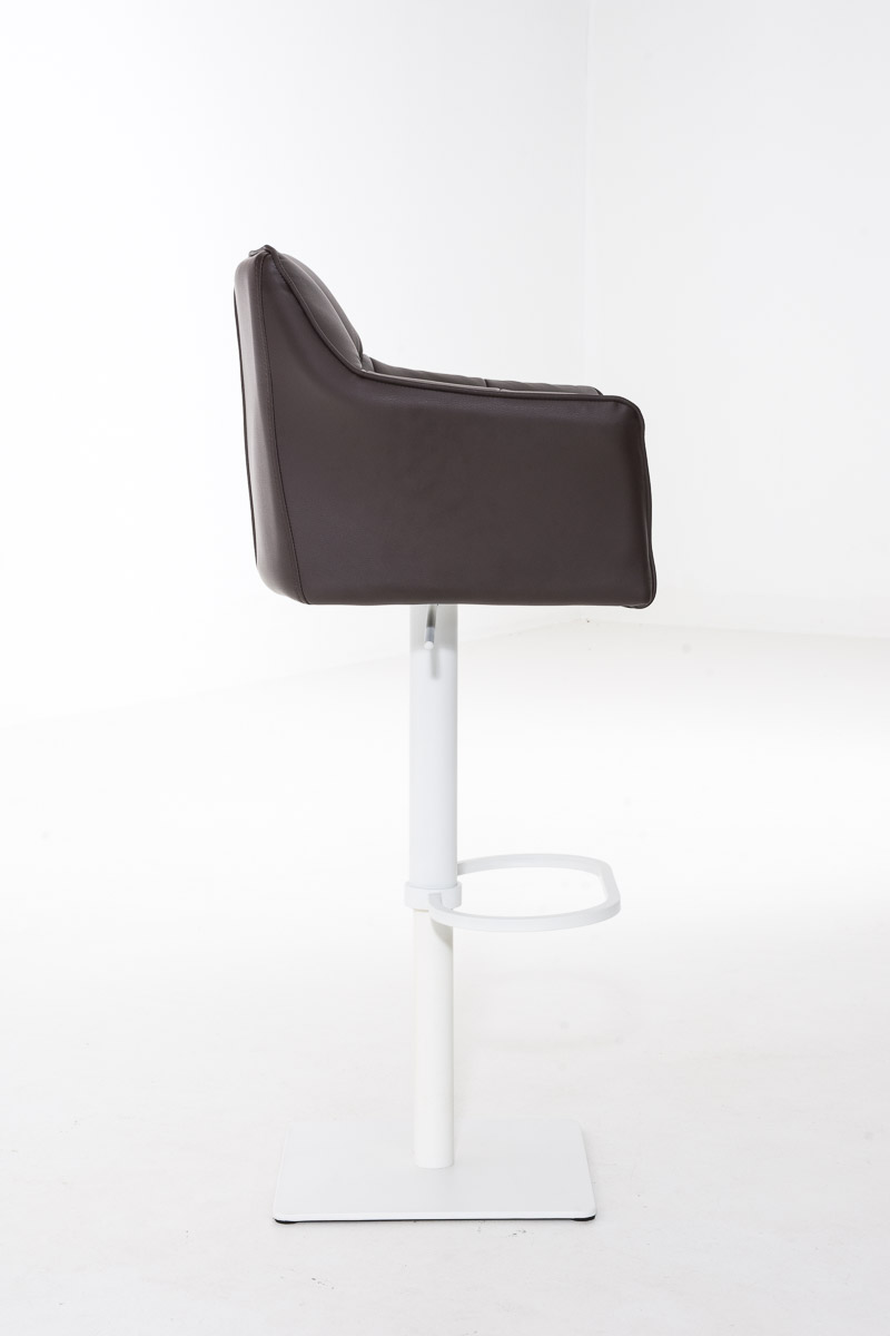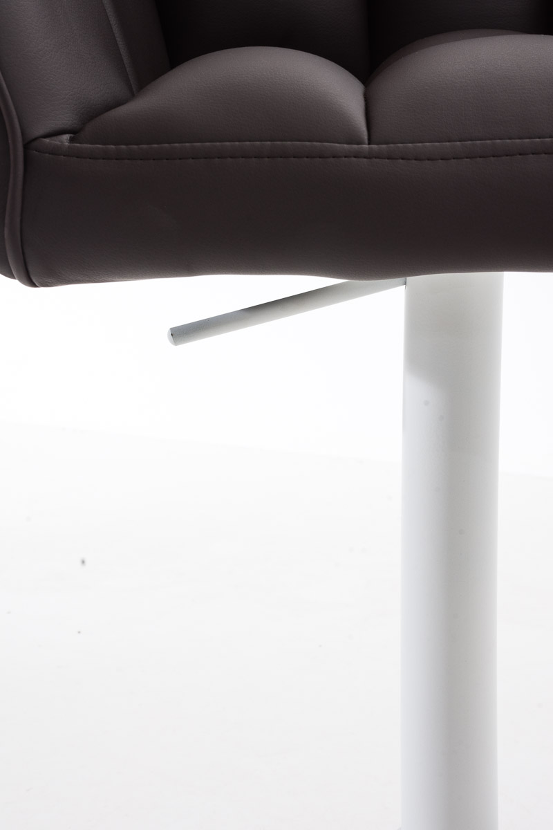Trendy barová židle s bílým rámem a čalouněným sedákem. Nabízí moderní design, pohodlí a praktické funkce jako otáčení, nastavení výšky a opěrky nohou. Ideální volba pro stylový interiér.