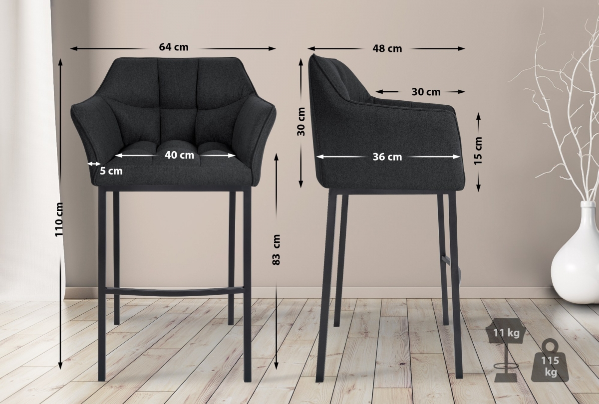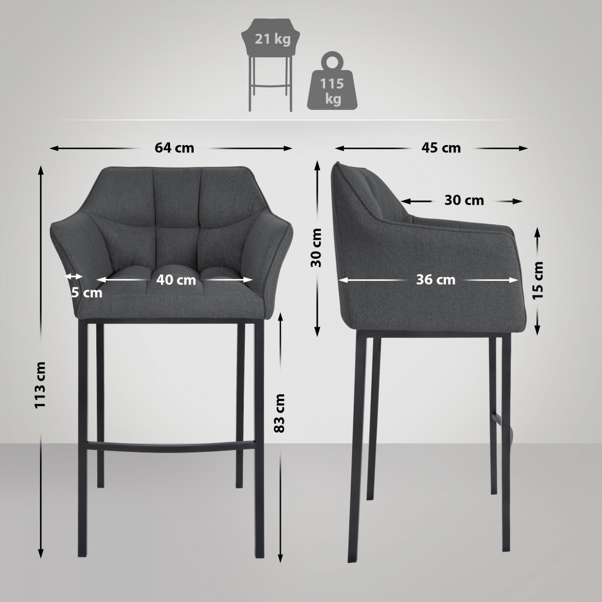 Elegantní barová židle Damaso spojuje pohodlí a styl. S polstrovaným potahem, opěrkou nohou a rámem z nerezavějící oceli je ideální do barů či kuchyní. Nosnost 115 kg, výška 110 cm, dostupná v různých barvách.