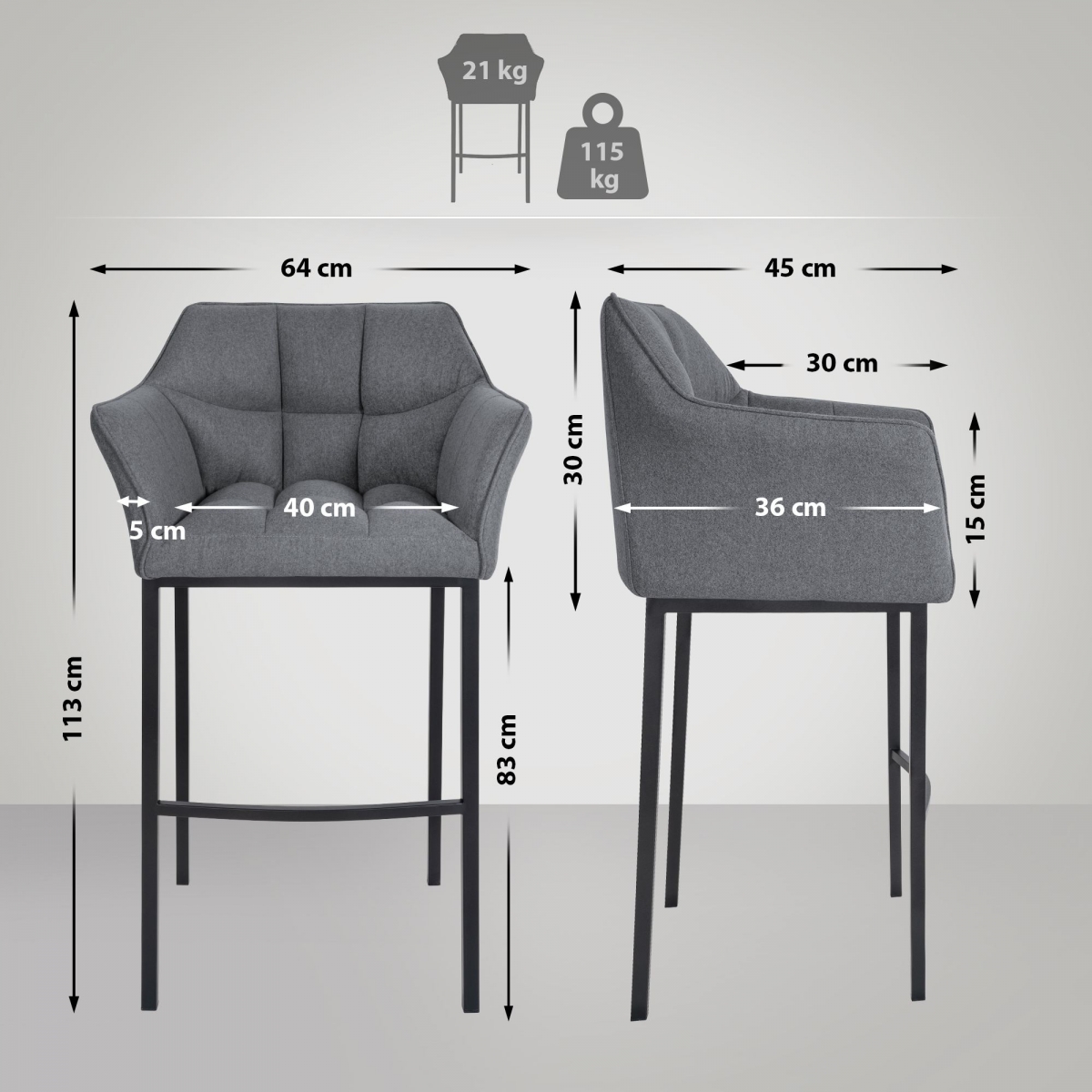 Elegantní barová židle Damaso spojuje pohodlí a styl. S polstrovaným potahem, opěrkou nohou a rámem z nerezavějící oceli je ideální do barů či kuchyní. Nosnost 115 kg, výška 110 cm, dostupná v různých barvách.
