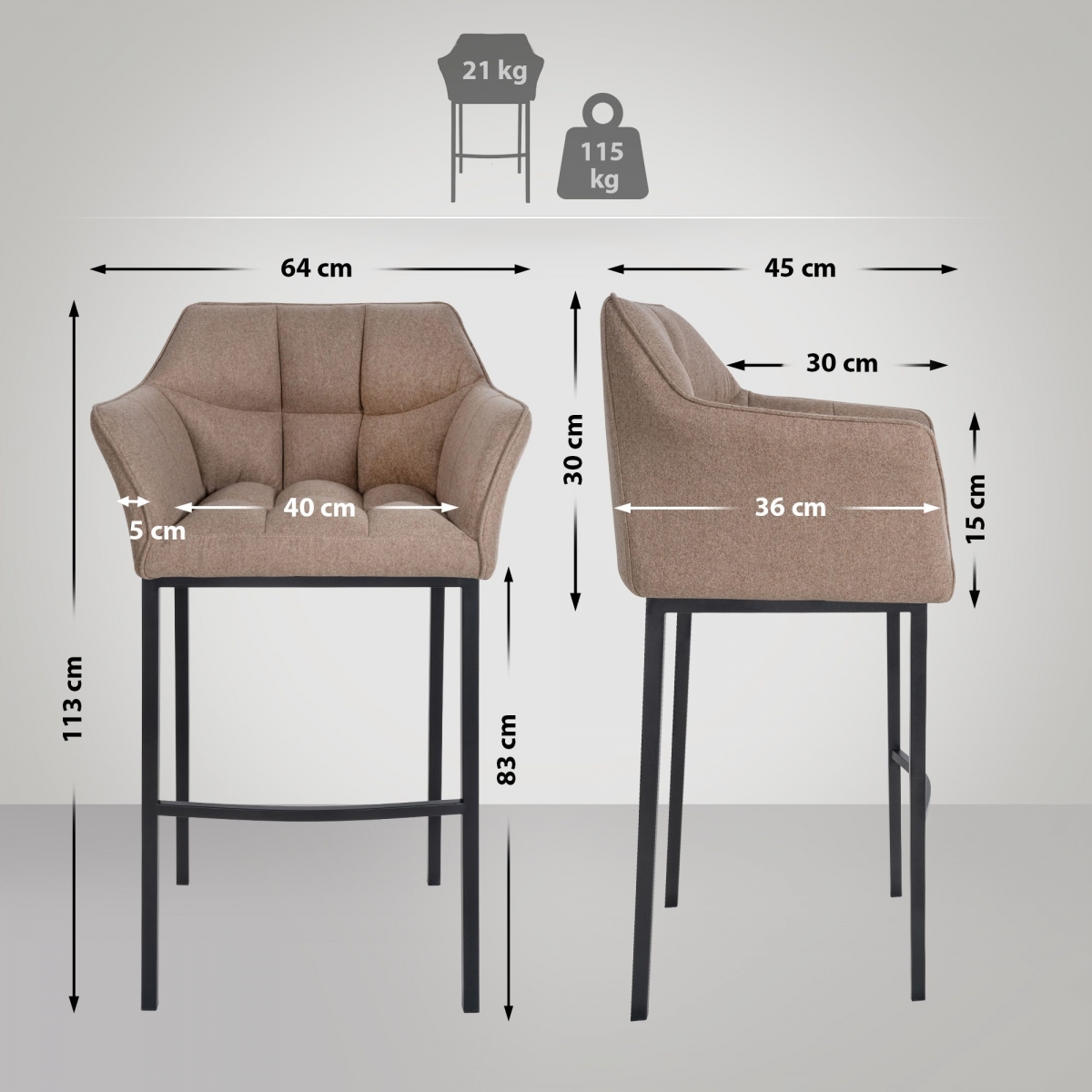 Elegantní barová židle Damaso spojuje pohodlí a styl. S polstrovaným potahem, opěrkou nohou a rámem z nerezavějící oceli je ideální do barů či kuchyní. Nosnost 115 kg, výška 110 cm, dostupná v různých barvách.