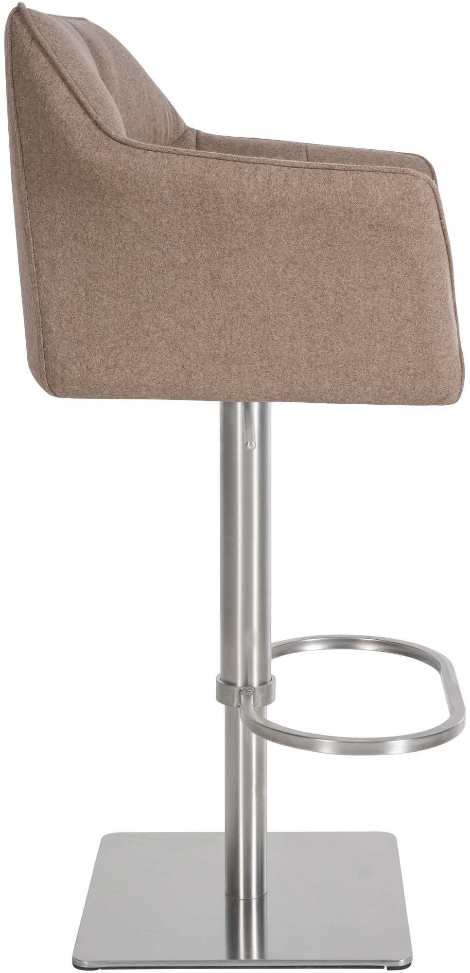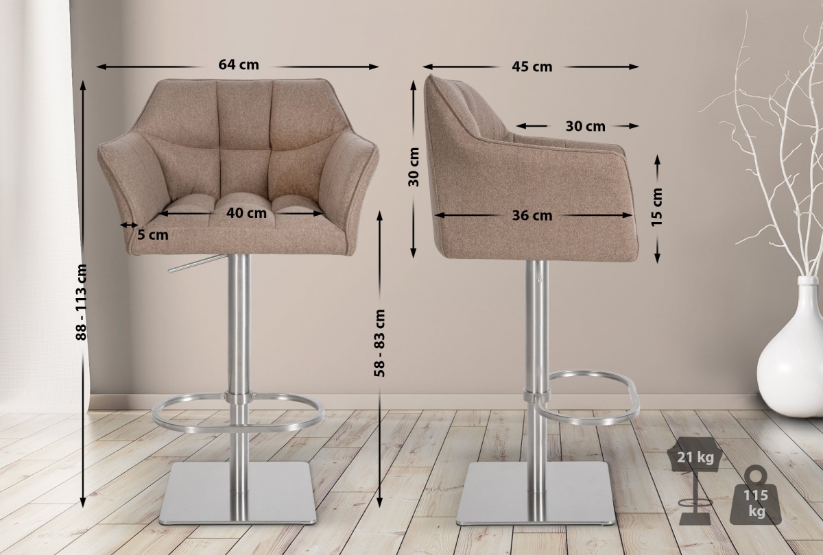 Opěradlo a područky poskytují dodatečné pohodlí při sezení a uvolněnou polohu. Barová židle je plynule výškově nastavitelná, takže výšku sedáku lze nastavit v rozmezí 58 až 83 cm.