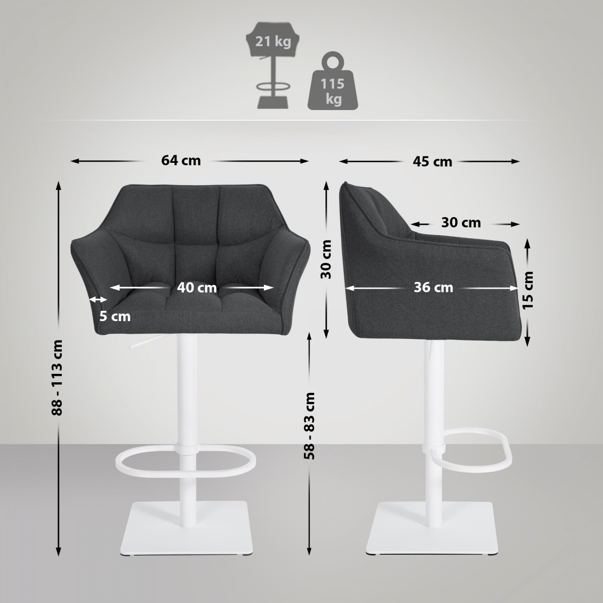 Elegantní barová židle Damaso s nastavitelnou výškou a otáčením o 360°. Nabízí maximální pohodlí díky polstrovanému potahu, opěrce nohou a rámu z nerezavějící oceli. Ideální pro bary, kuchyňské linky a salonky.