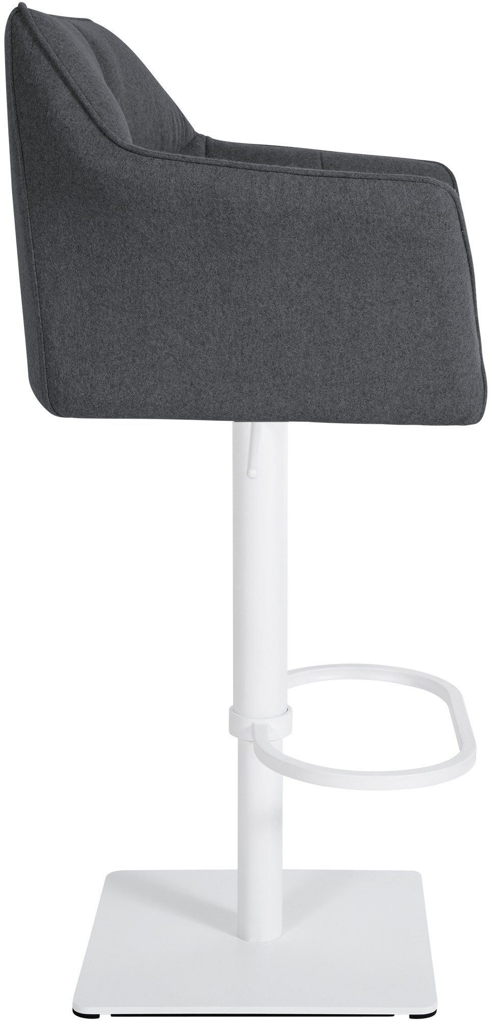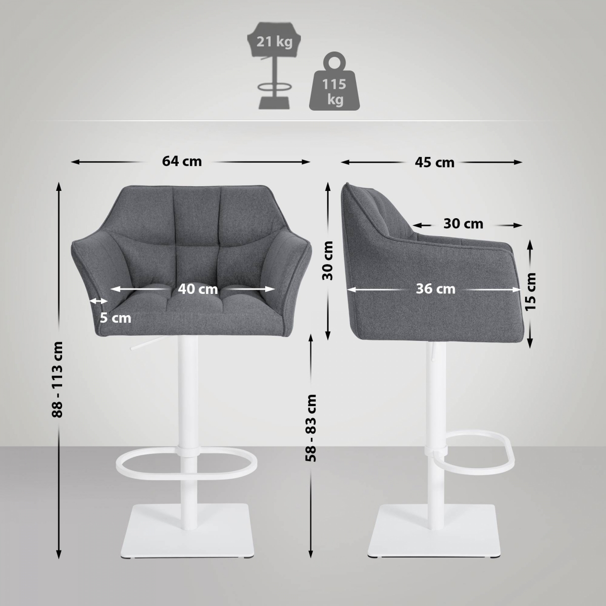 Opěradlo a područky poskytují dodatečné pohodlí při sezení a uvolněnou polohu. Barová židle je plynule výškově nastavitelná, takže výšku sedáku lze nastavit v rozmezí 58 až 83 cm.