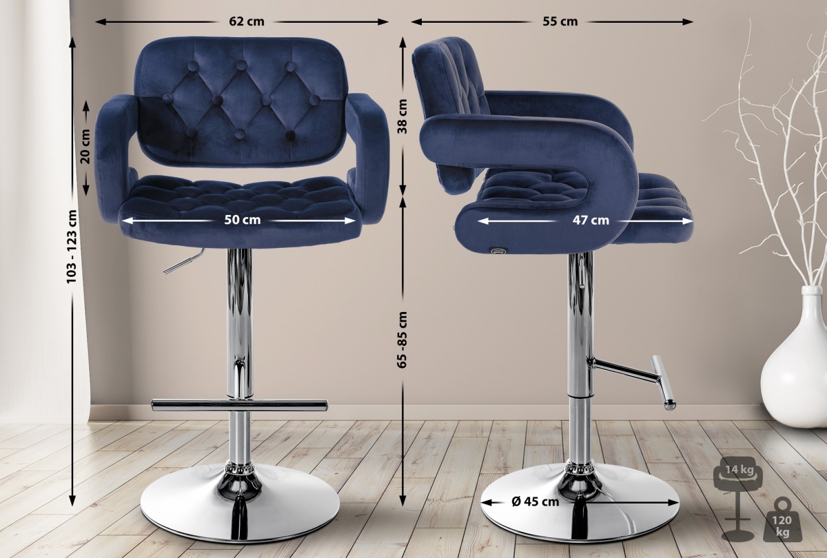 Barová židle Dublin spojuje eleganci s moderním komfortem. Plynule nastavitelná výška sedu 65-85 cm, pohodlné opěrky a nosnost 120 kg z ní dělají všestranný kousek nábytku pro domácnost i komerční prostory.