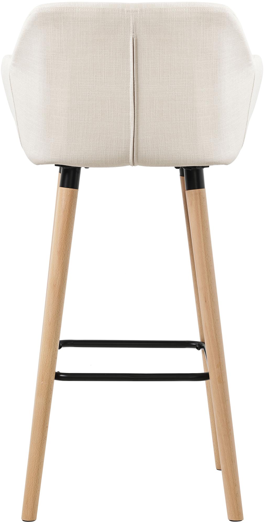 Moderní barová židle s textilním čalouněním a dřevěným rámem. Pohodlné sezení díky ergonomickému designu, stabilní konstrukce s kovovou opěrkou na nohy, nosnost 110 kg. Ideální do moderního interiéru baru nebo kuchyně.