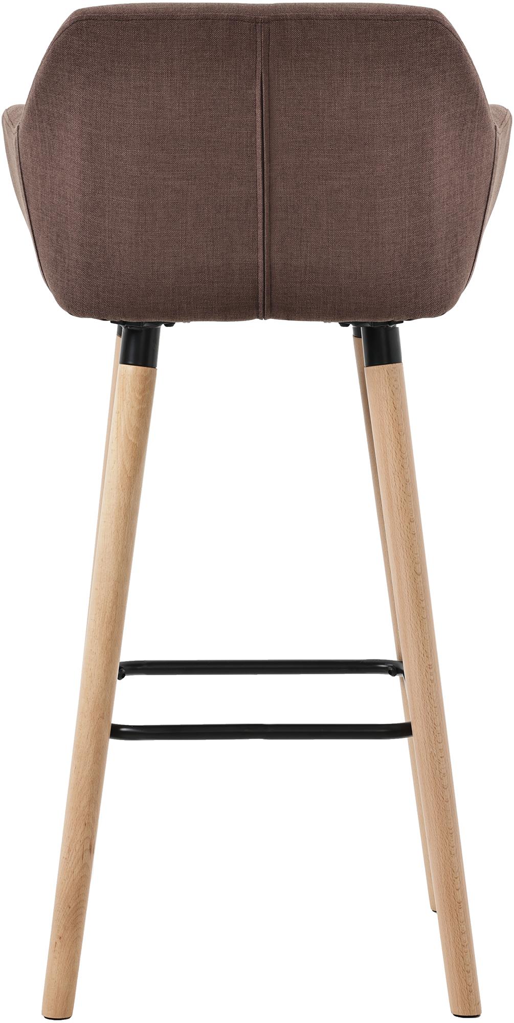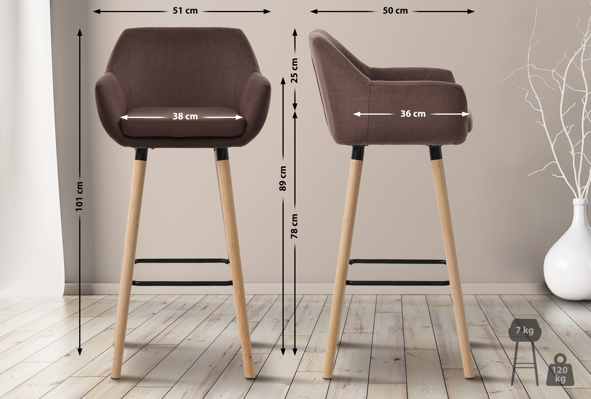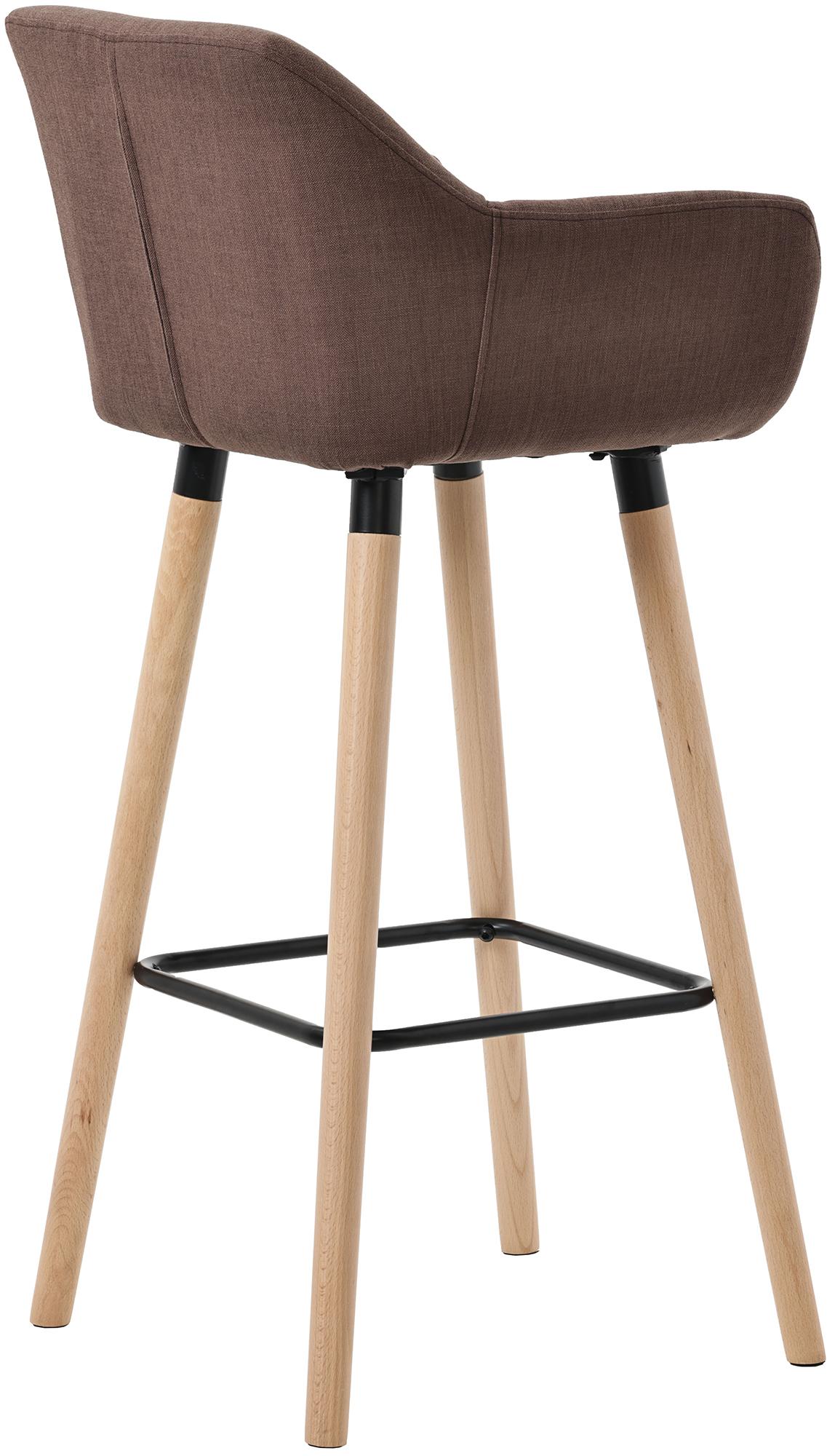 Moderní barová židle s textilním čalouněním a dřevěným rámem. Pohodlné sezení díky ergonomickému designu, stabilní konstrukce s kovovou opěrkou na nohy, nosnost 110 kg. Ideální do moderního interiéru baru nebo kuchyně.