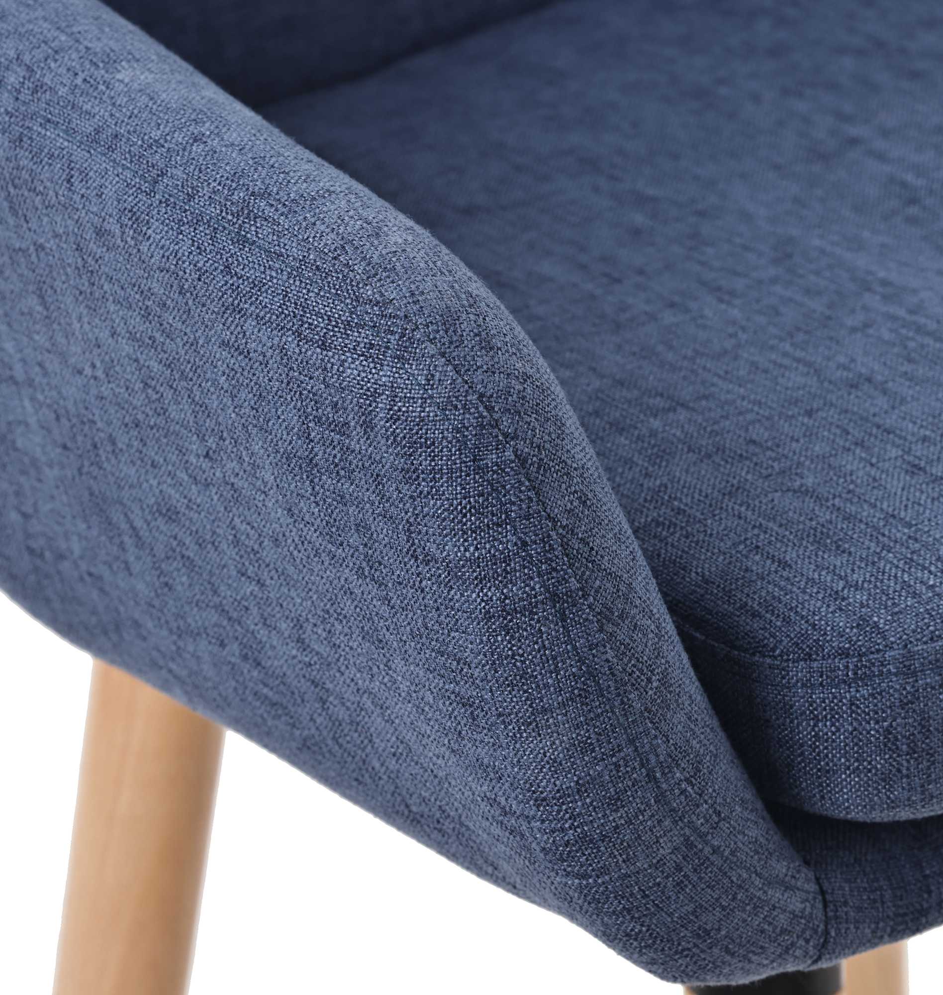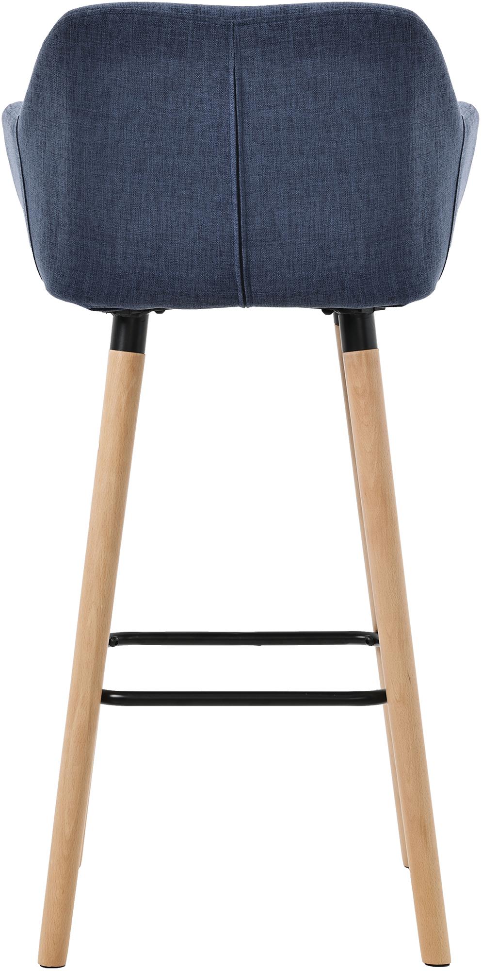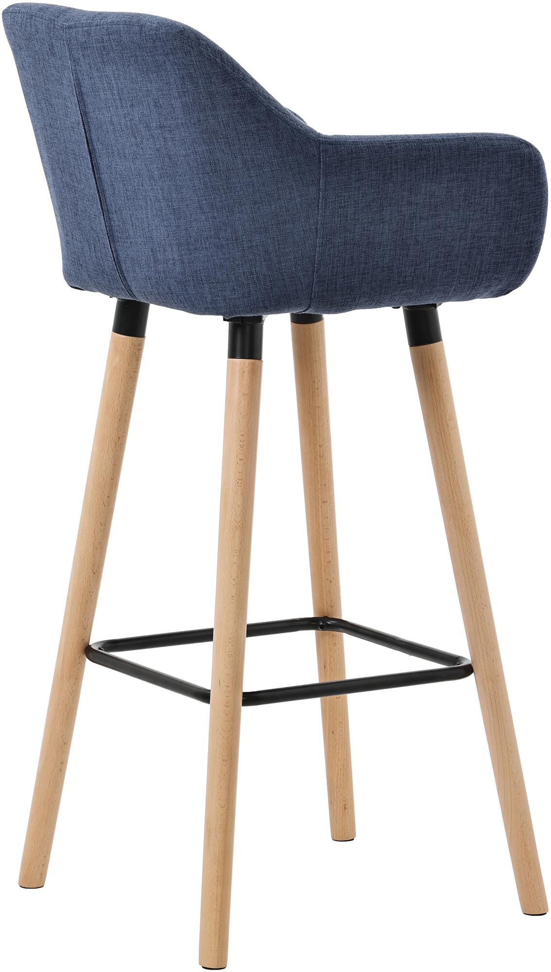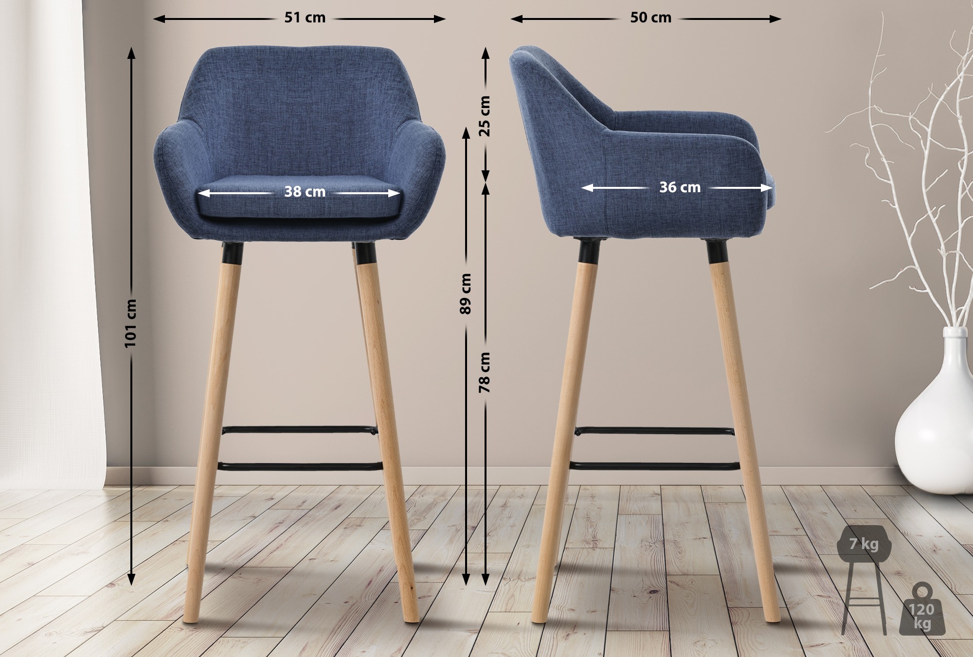 Moderní barová židle s textilním čalouněním a dřevěným rámem. Pohodlné sezení díky ergonomickému designu, stabilní konstrukce s kovovou opěrkou na nohy, nosnost 110 kg. Ideální do moderního interiéru baru nebo kuchyně.