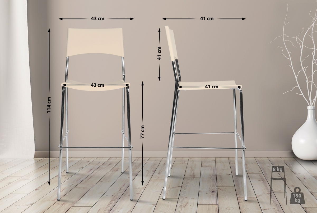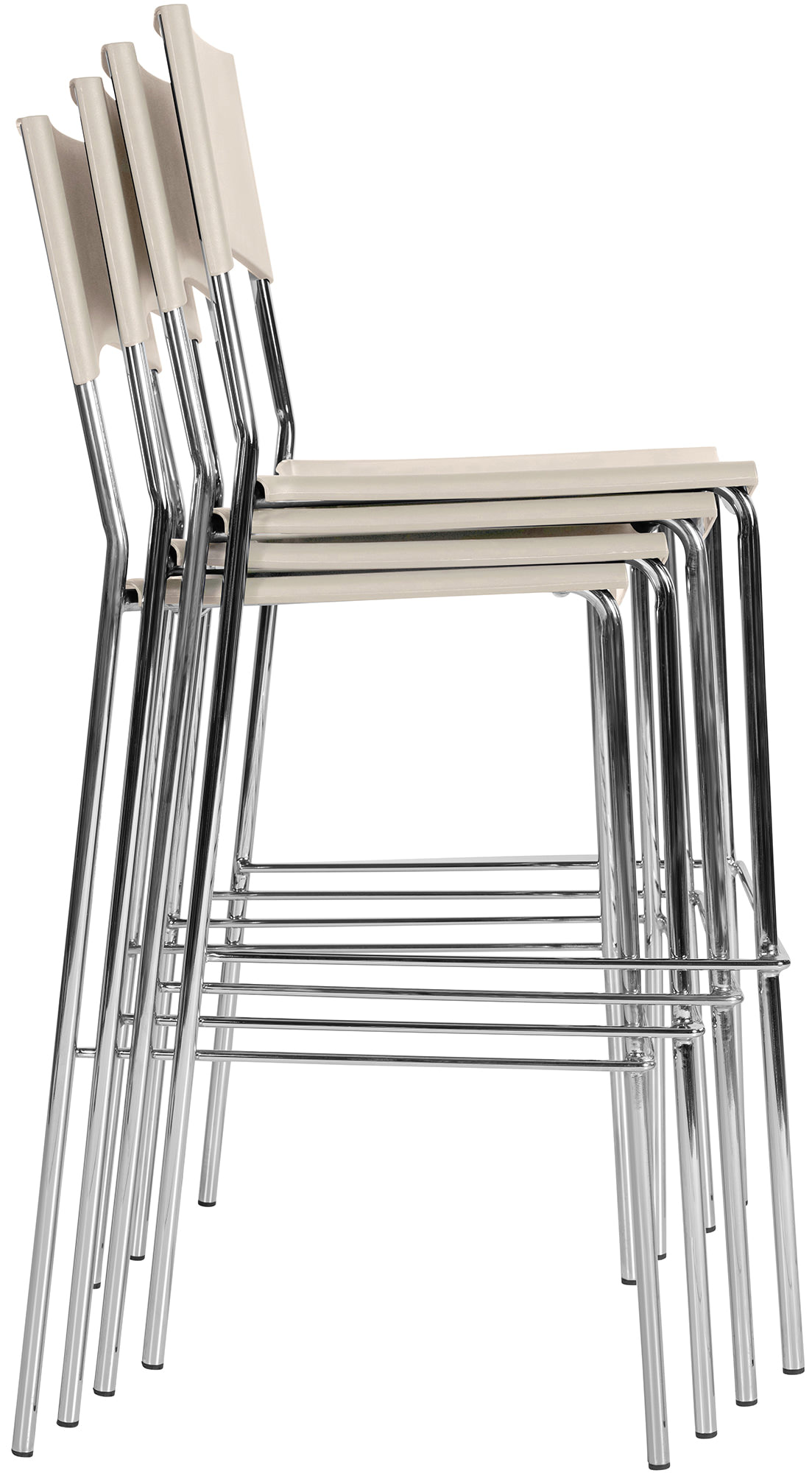Moderní stohovatelná barová židle s odolným plastovým sedákem a chromovanou základnou. Vhodná pro veletrhy, koncerty, pohostinství i domácnost. Výška 113 cm, sezení 77 cm, jednoduchý a funkční design.