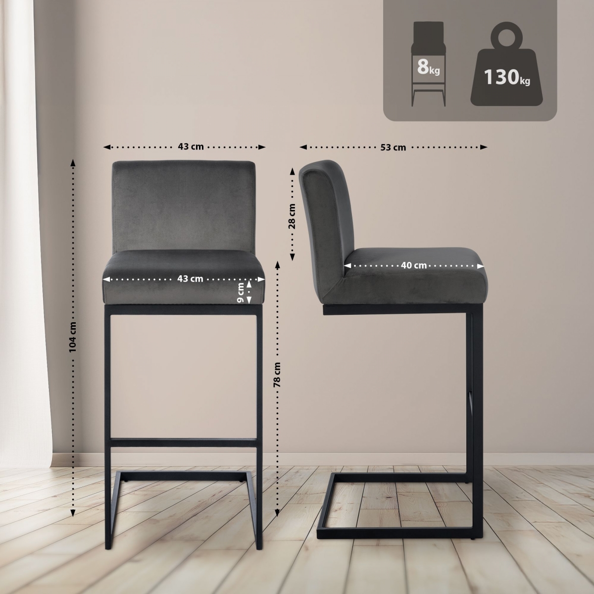 Jeho rovný konzolový rám z práškově lakovaného kovu upoutá pozornost a mírné houpání sedáku je vnímáno jako velmi příjemné. Integrovaná příčná vzpěra slouží jako pohodlná opěrka nohou, zatímco opěradlo na sedáku podpírá spodní část zad. Sedák a opěradlo jsou bohatě polstrované a potažené elegantním sametm potahem.