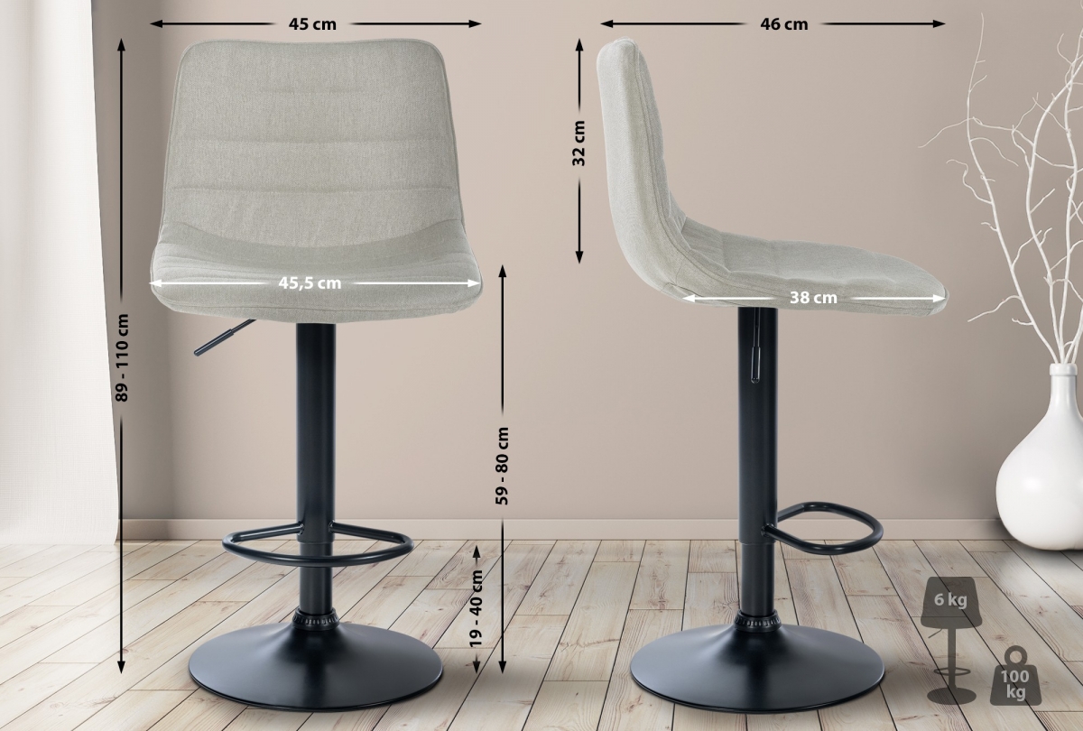 Látková barová židle Lex kombinuje moderní design s maximálním komfortem. Plynule výškově nastavitelná s otočným sedadlem o 360°, poskytuje pohodlné sezení díky čalouněnému opěradlu a opěrce nohou. Ideální pro obývací pokoj, jídelnu nebo kuchyni.