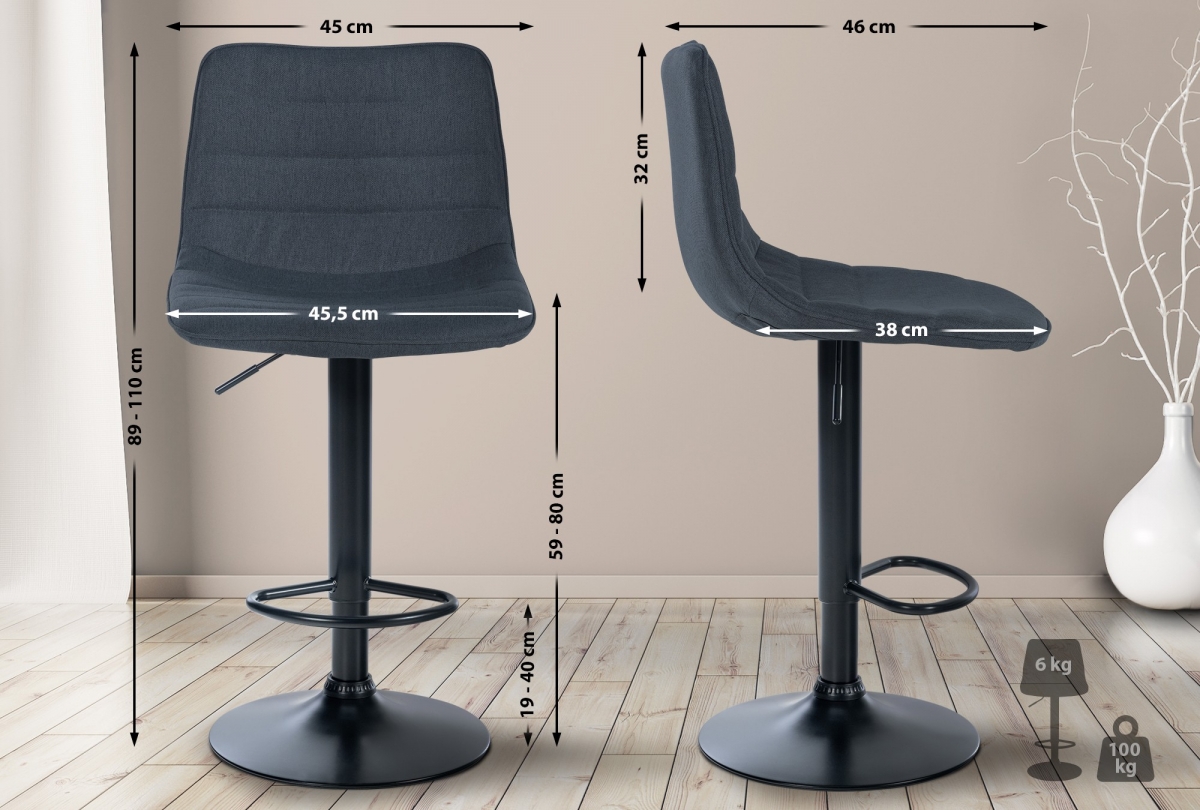 Látková barová židle Lex kombinuje moderní design s maximálním komfortem. Plynule výškově nastavitelná s otočným sedadlem o 360°, poskytuje pohodlné sezení díky čalouněnému opěradlu a opěrce nohou. Ideální pro obývací pokoj, jídelnu nebo kuchyni.