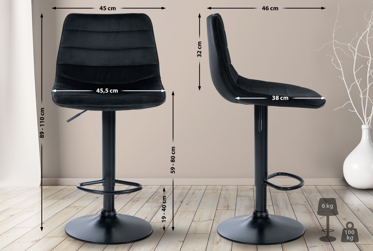 Luxusní sametová barová židle Lex s nastavitelnou výškou a otočným sedadlem. Maximální komfort díky čalouněnému opěradlu a opěrce nohou. Elegantní design v různých barvách pro každý interiér.