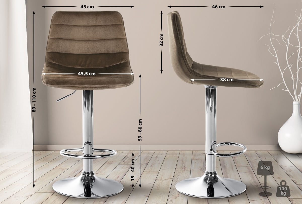 Luxusní sametová barová židle Lex s nastavitelnou výškou a otočným sedadlem. Maximální komfort díky čalouněnému opěradlu a opěrce nohou. Elegantní design v různých barvách pro každý interiér.