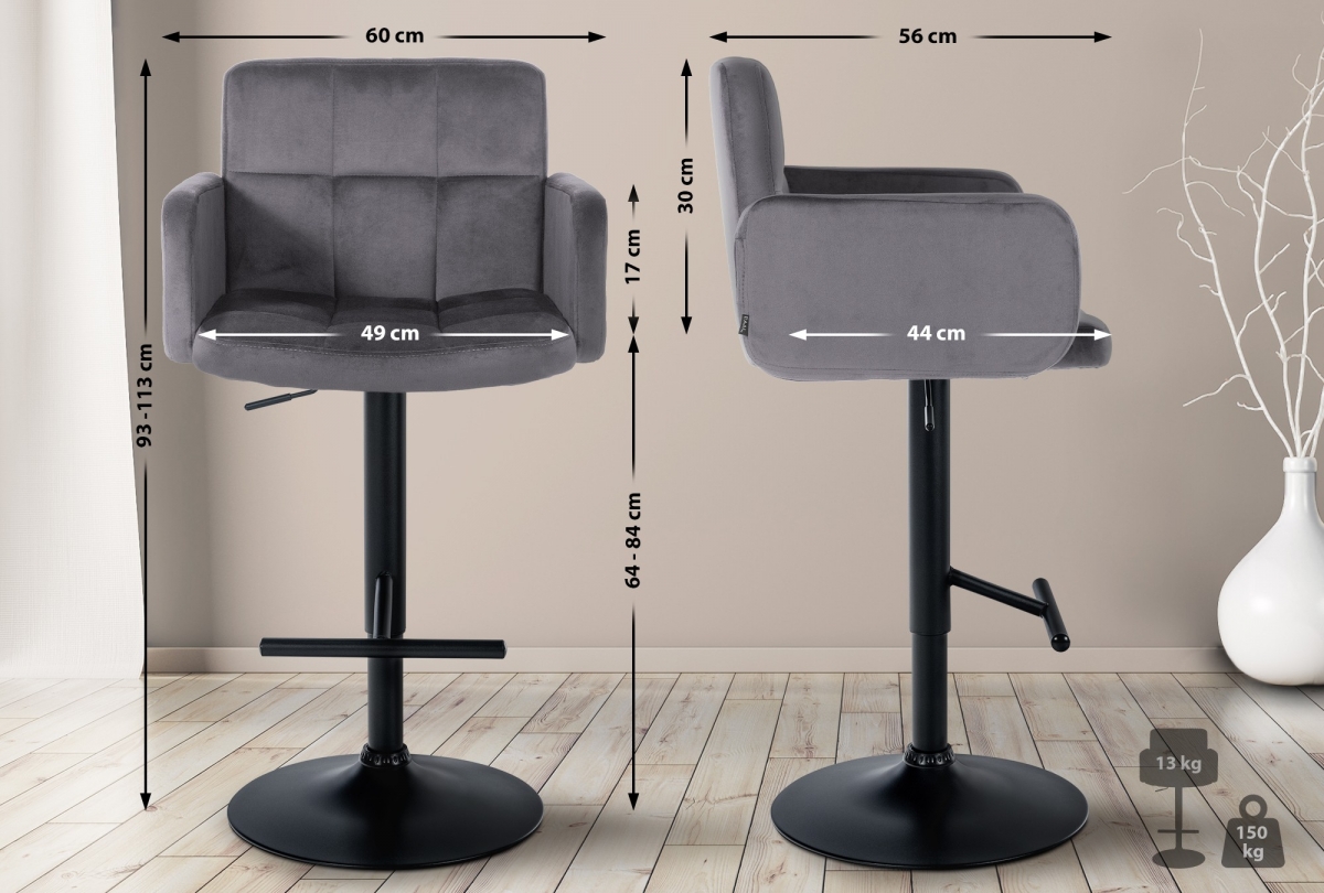 Luxusní barová židle Los Angeles v sametovém provedení. Designová a pohodlná, s nastavitelnou výškou a otáčením o 360°. Ideální pro každodenní použití v baru či kuchyni díky vysokému opěradlu a loketním opěrkám.