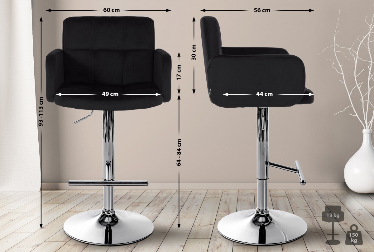 Luxusní barová židle Los Angeles v sametovém provedení. Designová a pohodlná, s nastavitelnou výškou a otáčením o 360°. Ideální pro každodenní použití v baru či kuchyni díky vysokému opěradlu a loketním opěrkám.