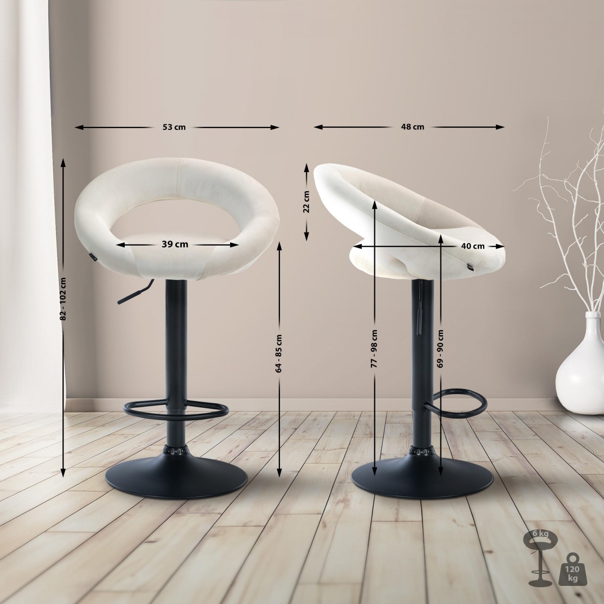 Elegantní barová židle Olinda s luxusním sametovým potahem a plynulým nastavením výšky 60-81 cm. Nabízí pohodlné sezení s nosností až 120 kg, zakřiveným opěradlem a stabilním kovovým rámem s podnožkou.