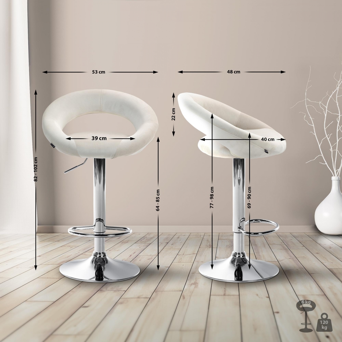 Elegantní barová židle Olinda s luxusním sametovým potahem a plynulým nastavením výšky 60-81 cm. Nabízí pohodlné sezení s nosností až 120 kg, zakřiveným opěradlem a stabilním kovovým rámem s podnožkou.