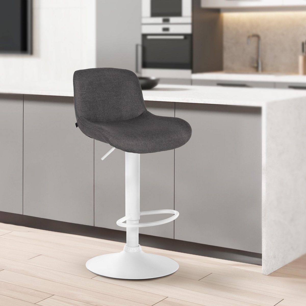 Bílý kovový rám taburetky a módní potah dodávají taburetce elegantní vzhled. Sedák je k dispozici buď z odolné látky, nebo z elegantního sametu. Kovový rám je výškově nastavitelný a funkce otáčení o 360 stupňů zajišťuje dostatek volnosti pohybu.