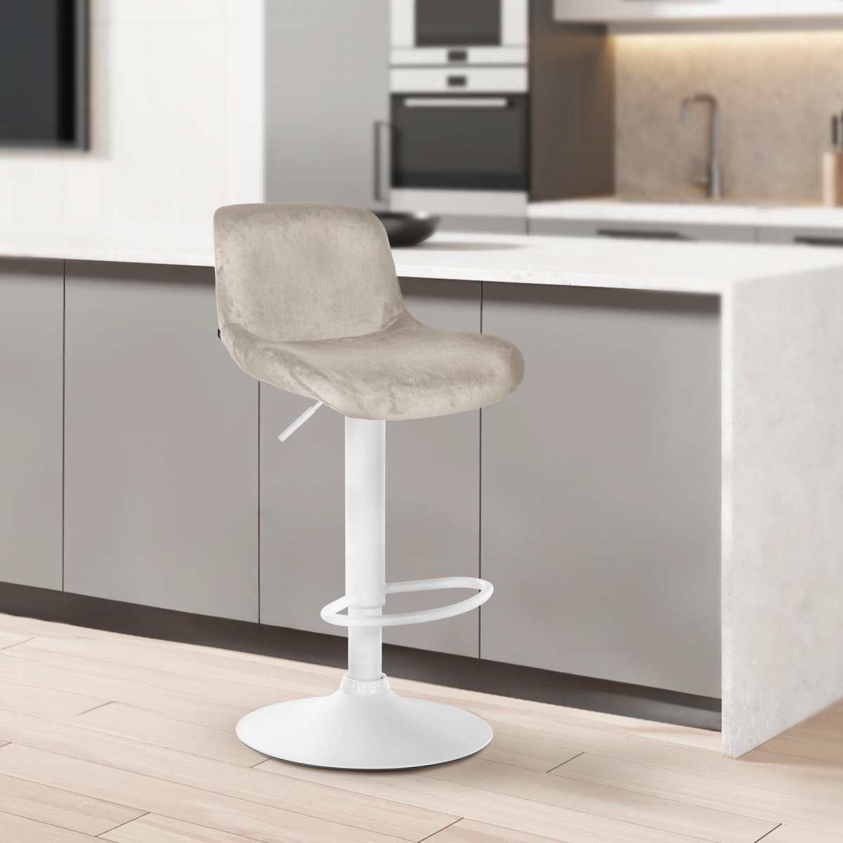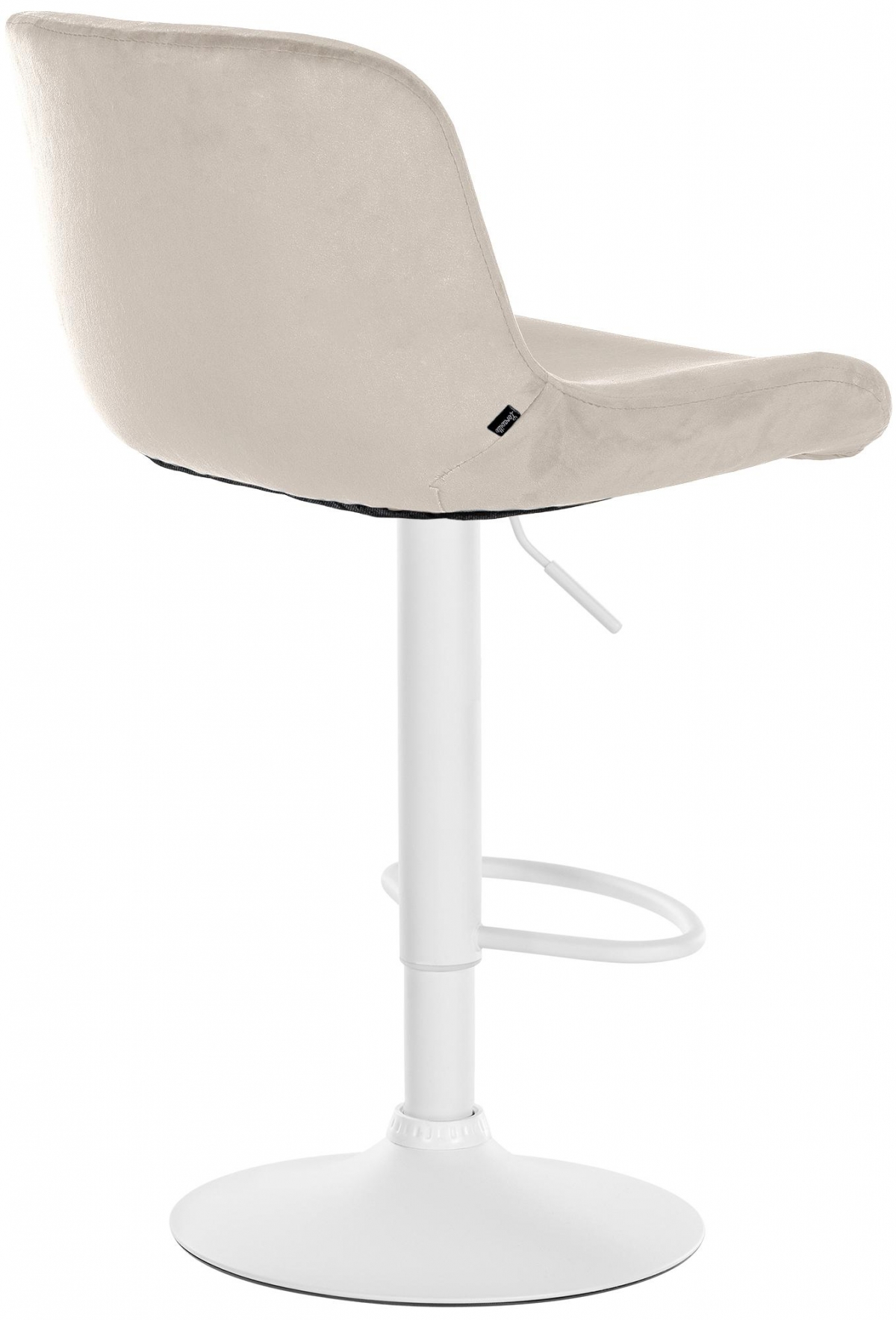 Bílý kovový rám taburetky a módní potah dodávají taburetce elegantní vzhled. Sedák je k dispozici buď z odolné látky, nebo z elegantního sametu. Kovový rám je výškově nastavitelný a funkce otáčení o 360 stupňů zajišťuje dostatek volnosti pohybu.