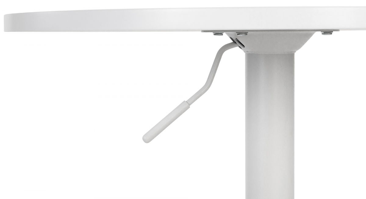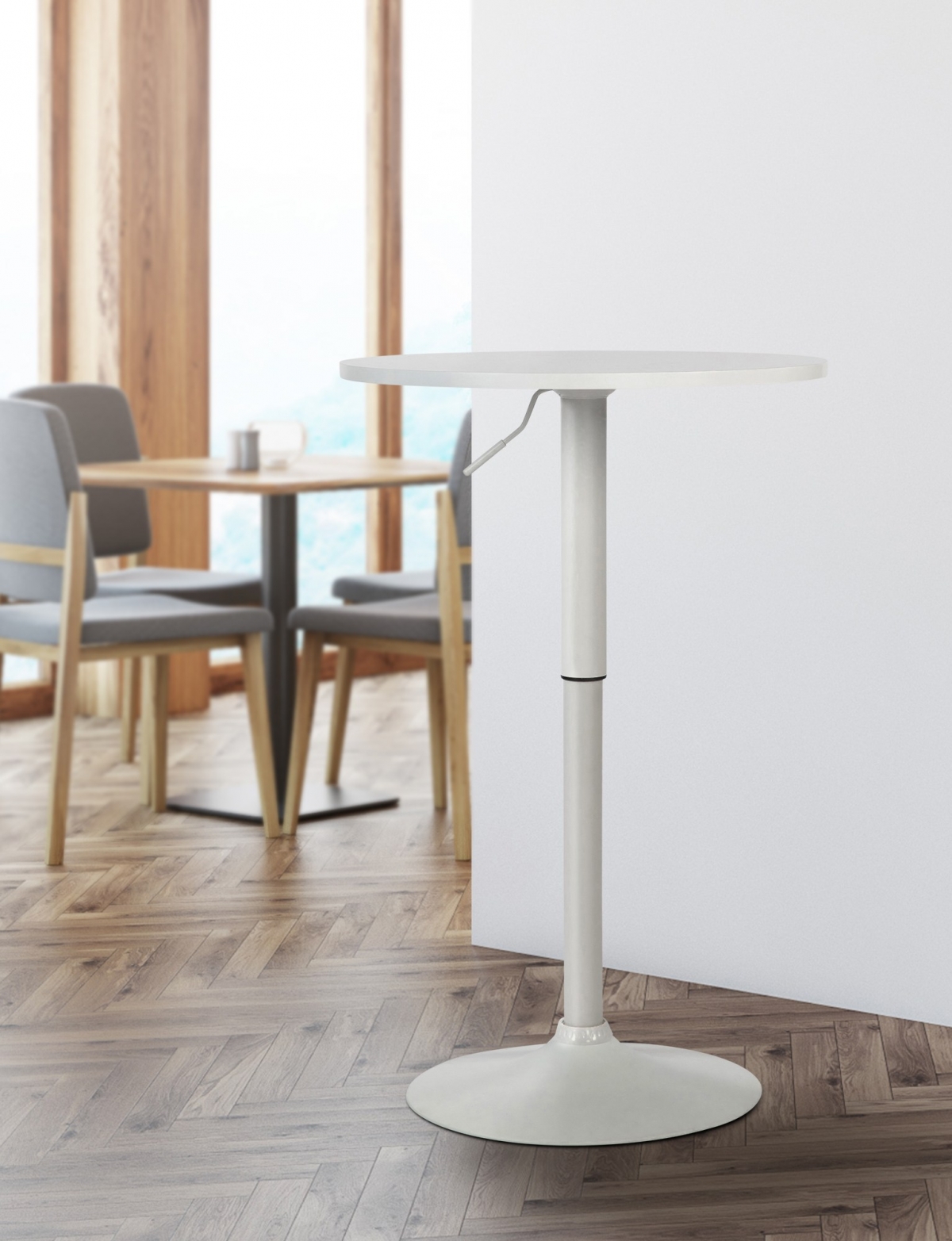 Všestranný výškově nastavitelný barový stůl Lamoni s robustním kovovým rámem a kulatou deskou o průměru 60 cm. Ideální do kuchyně, baru nebo na bankety, s možností nastavení výšky od 85 do 106 cm.