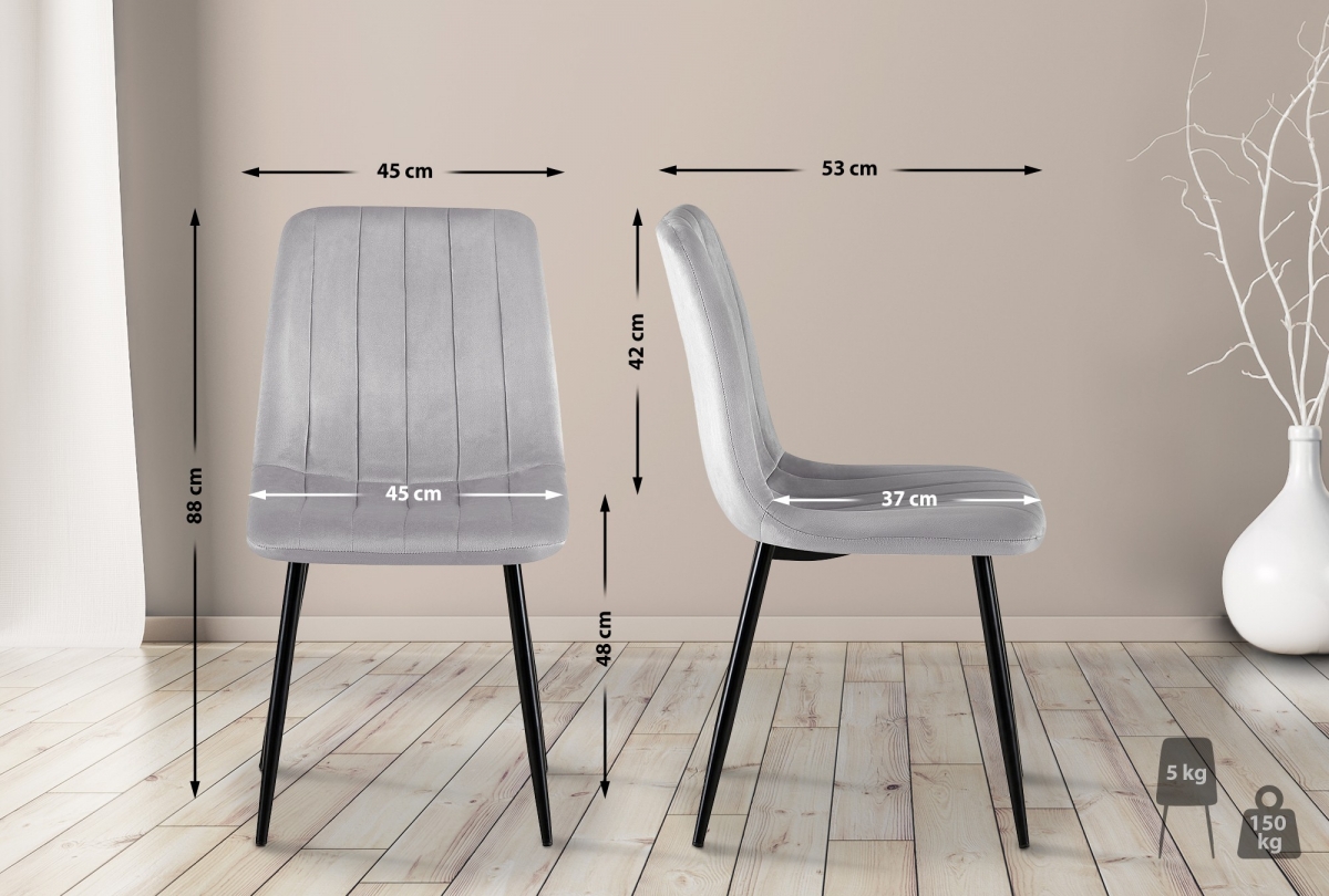 Elegantní jídelní židle s vysokým opěradlem a sametovým potahem pro moderní interiéry. Stylové prošívání, 4-nohá kovová základna a příjemné polstrování zaručují pohodlné sezení s nosností až 150 kg.