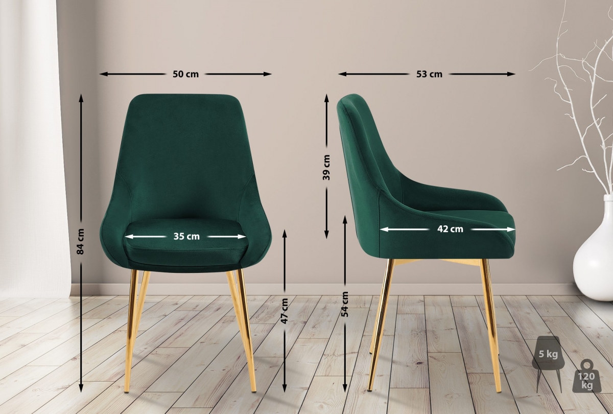 Jídelní židle Elmira s luxusním sametovým potahem nabízí stylové a pohodlné sezení do kuchyně či jídelny. Díky čalouněnému sedáku, opěrce a kovovému rámu o nosnosti 120 kg je ideální pro dlouhodobé sezení.