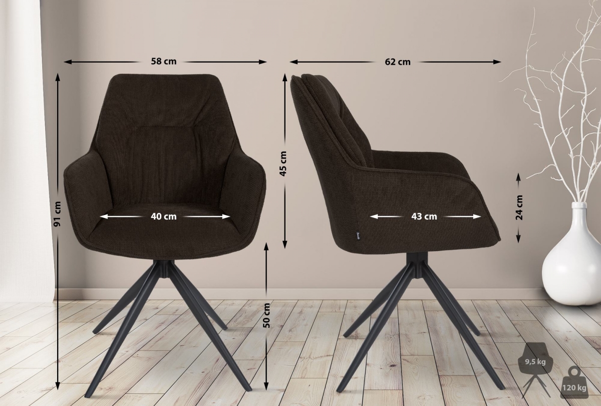 Jídelní židle Jules - moderní komfort s otočnou funkcí. Čalouněné sedátko, opěradlo a opěrky rukou poskytují pohodlí, zatímco robustní látkový potah zaručuje snadnou údržbu. Dostupná v 7 barvách, s nosností až 120 kg.