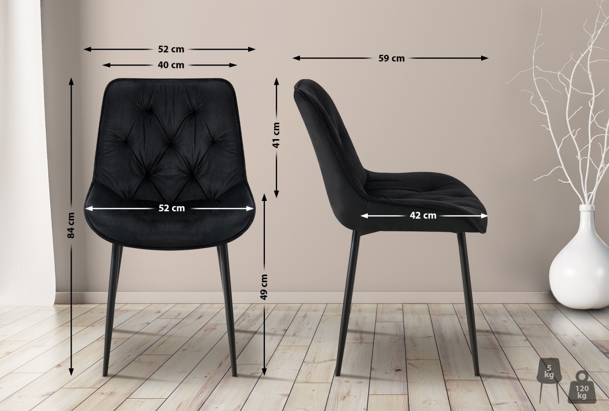 Jídelní židle Wallace kombinuje vysoký komfort sezení s moderním vzhledem. Tato čalouněná židle je skvělou volbou pro váš jídelní stůl, kuchyň, obývací pokoj, ale i pro jiné účely. Klíčem k pohodlnému sezení je příjemné polstrování přes sedák a opěradlo. Sedačka má snadno udržovatelný sametový potah s módním prošívaným vzorem. Základem této jídelní židle je stabilní černý čtyřnohý rám vyrobený z pevného kovu. To znamená, že kuchyňská židle bezpečně unese až 120 kg. Podlahové chrániče zabraňují poškození citlivých podlah.