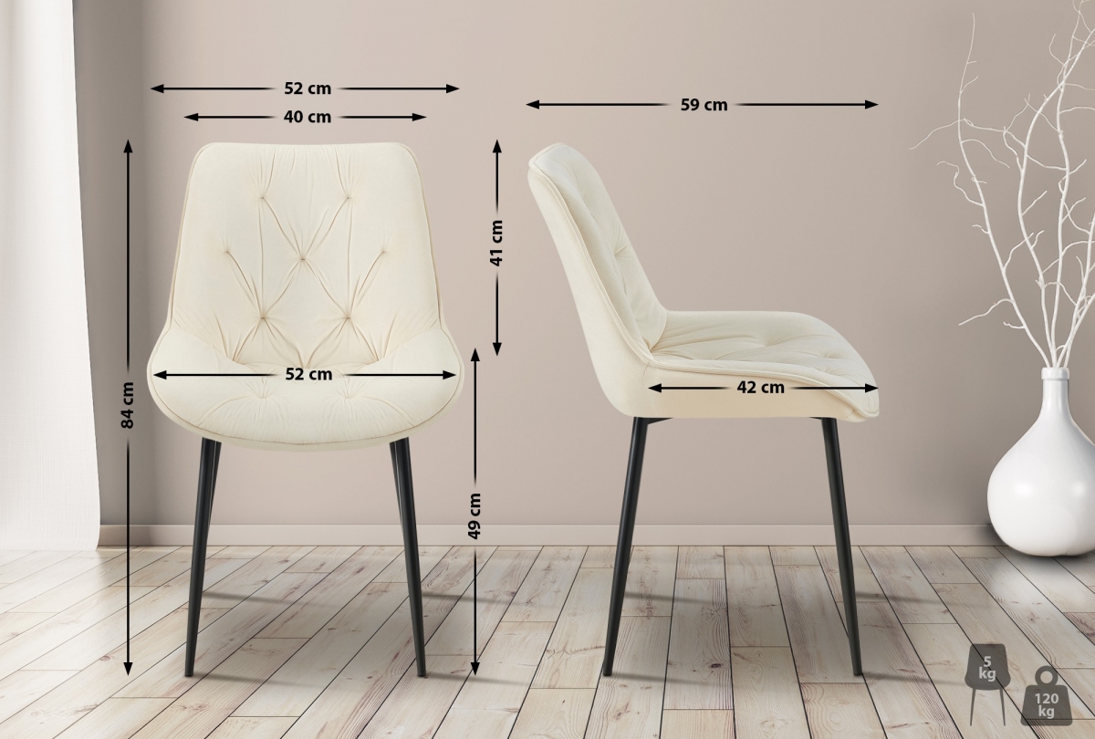 Jídelní židle Wallace kombinuje vysoký komfort sezení s moderním vzhledem. Tato čalouněná židle je skvělou volbou pro váš jídelní stůl, kuchyň, obývací pokoj, ale i pro jiné účely. Klíčem k pohodlnému sezení je příjemné polstrování přes sedák a opěradlo. Sedačka má snadno udržovatelný sametový potah s módním prošívaným vzorem. Základem této jídelní židle je stabilní černý čtyřnohý rám vyrobený z pevného kovu. To znamená, že kuchyňská židle bezpečně unese až 120 kg. Podlahové chrániče zabraňují poškození citlivých podlah.