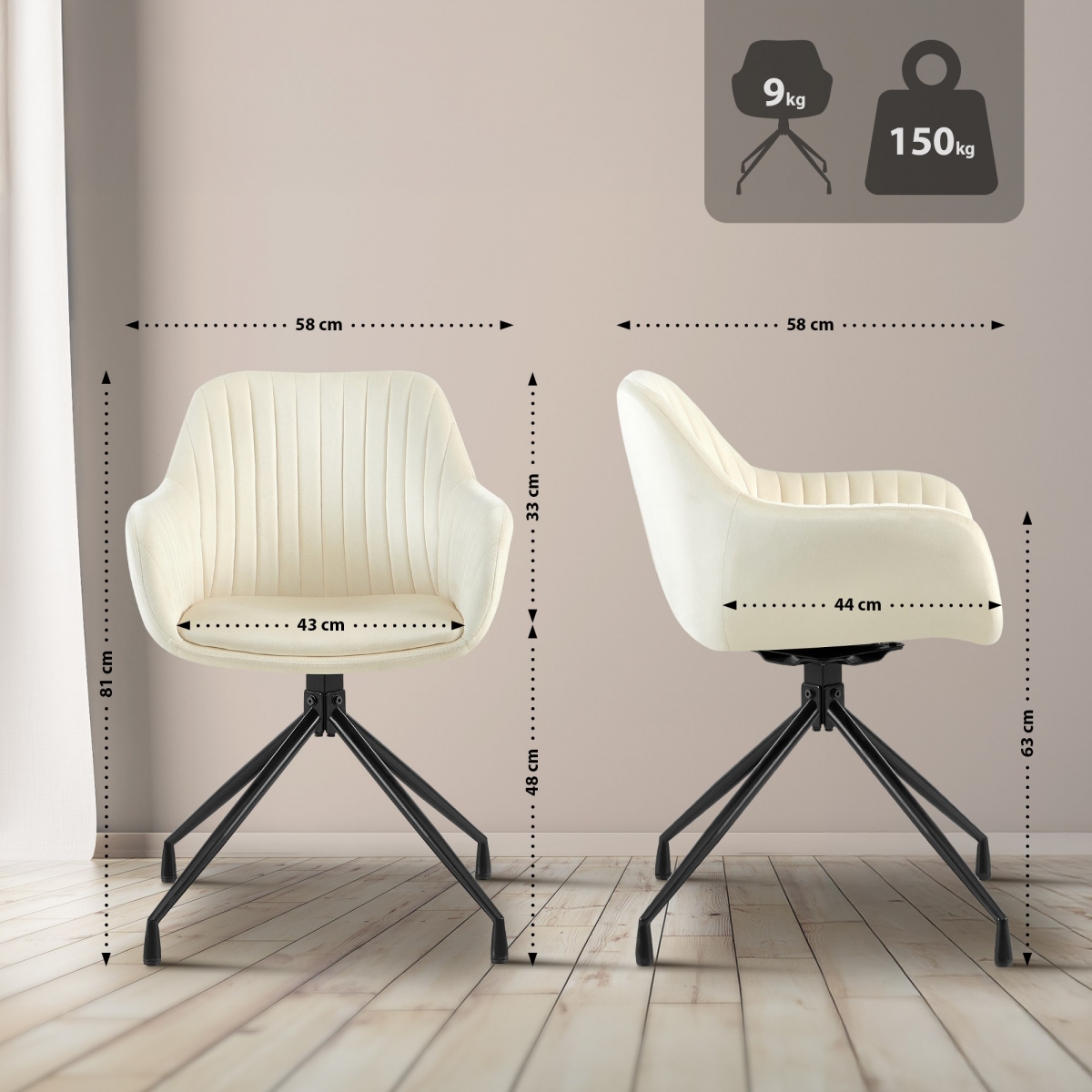Elegantní jídelní židle Welby s otočným sametovým potahem a černým kovovým rámem. Luxusní design s prošíváním, pohodlným čalouněním a nosností 150 kg pro všestranné využití v interiéru.