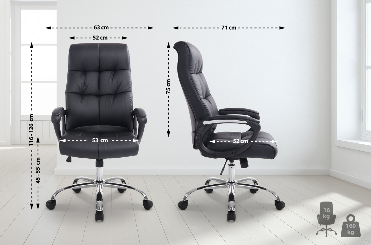 Luxusní XXL kancelářská židle s nosností až 160 kg. Kvalitní polstrování s koženkovým potahem, nastavitelná výška sedáku a naklápěcí mechanismus pro maximální komfort při práci. Ideální manažerská židle pro náročné uživatele.