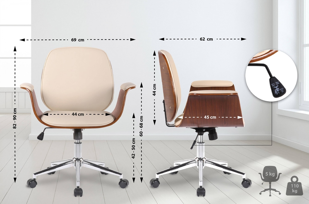 Elegantní kancelářská židle s dřevěným rámem z ohýbané překližky a kovovou konstrukcí. Ergonomické sedátko s nastavitelnou výškou, nakláněcím mechanismem a stabilní základnou s kolečky pro maximální pohodlí při práci.