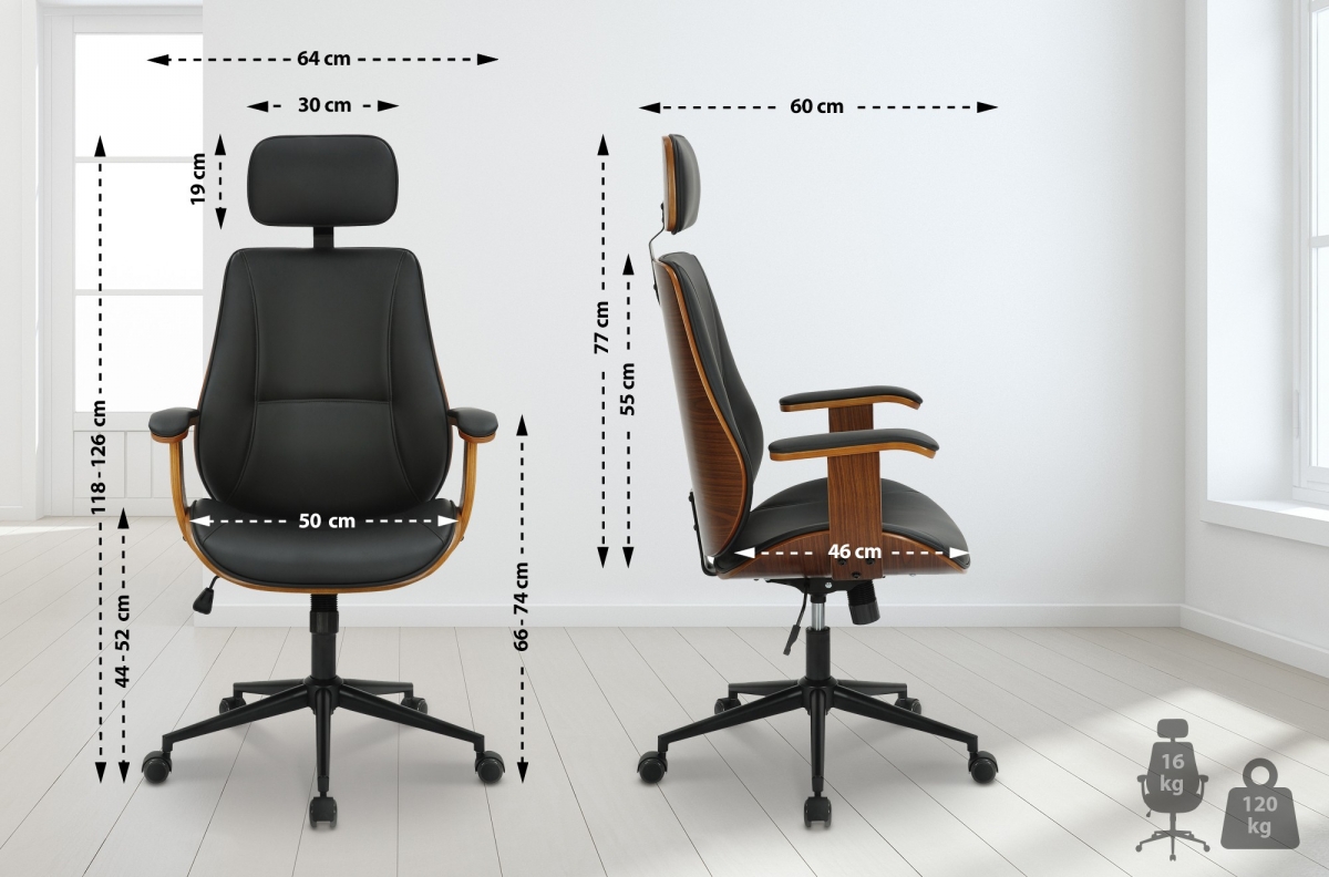 Kancelářská židle Lugo z umělé kůže nabízí ergonomický komfort a stylový design. Manažerská židle s dřevěným opěradlem, opěrkou hlavy a nastavitelným sedákem zaručuje optimální pohodlí při práci či hraní, s nosností až 120 kg.