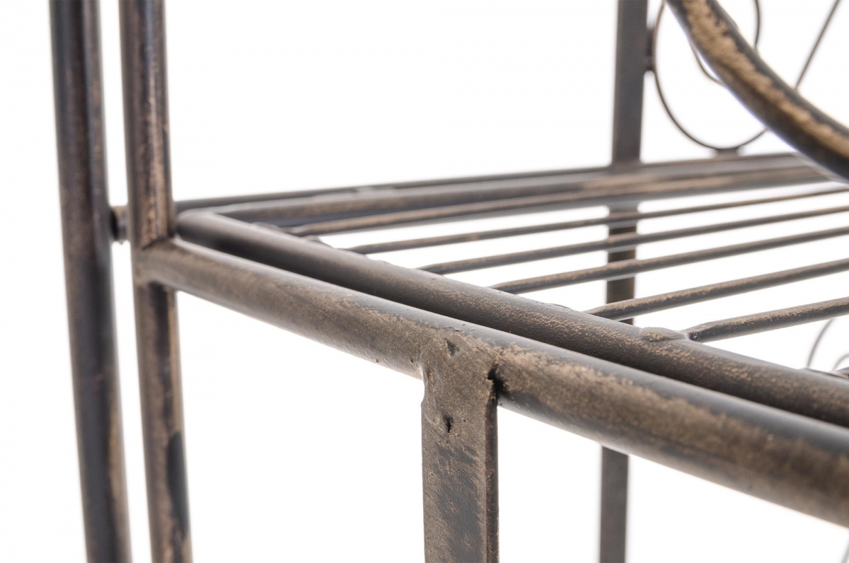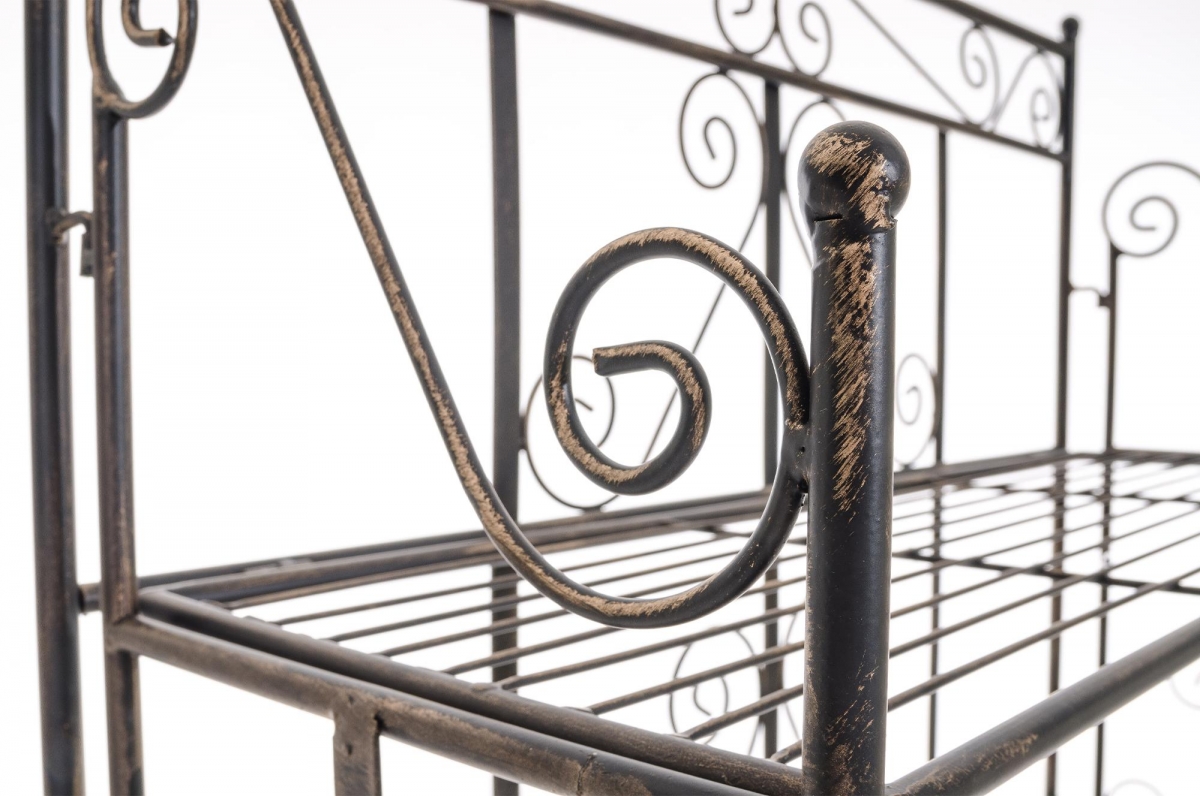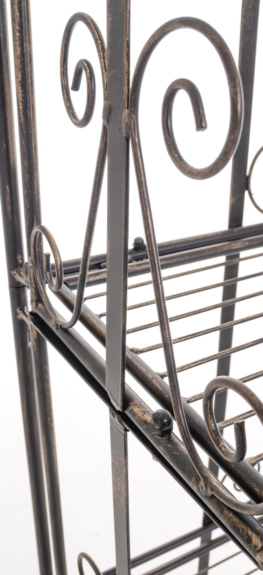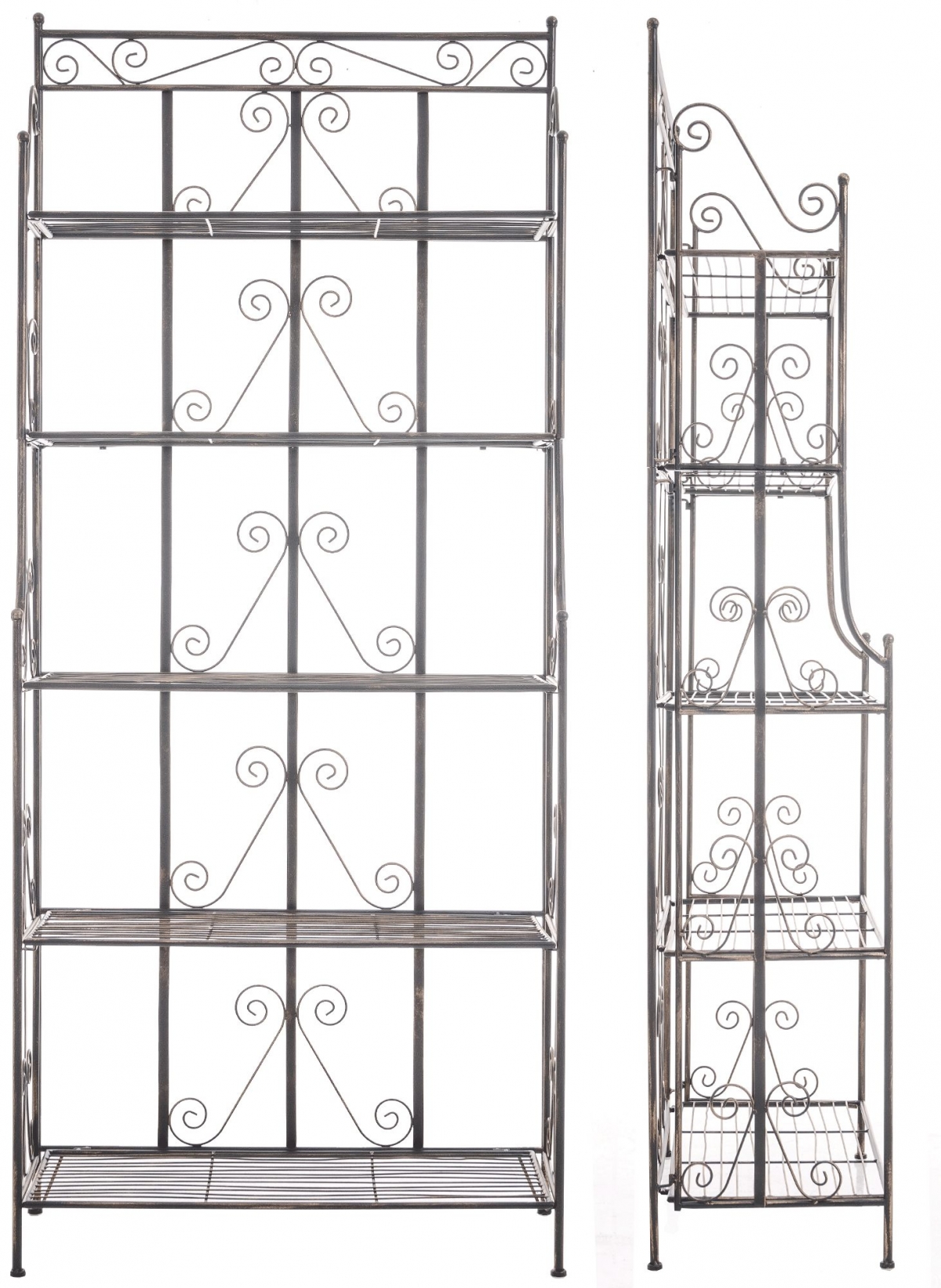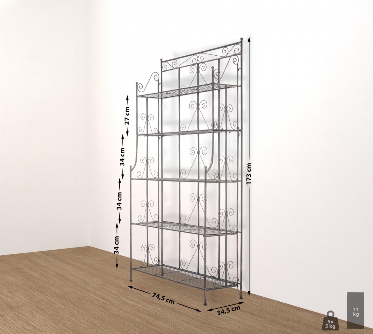 Robustní železná police ve venkovském stylu s 5 úrovněmi. Kvalitní práškový nátěr zajišťuje dlouhou životnost. Stabilní konstrukce s dekorativními prvky a jednoduchou montáží. Rozměry: 74,5 x 34,5 x 173 cm, nosnost 25 kg.